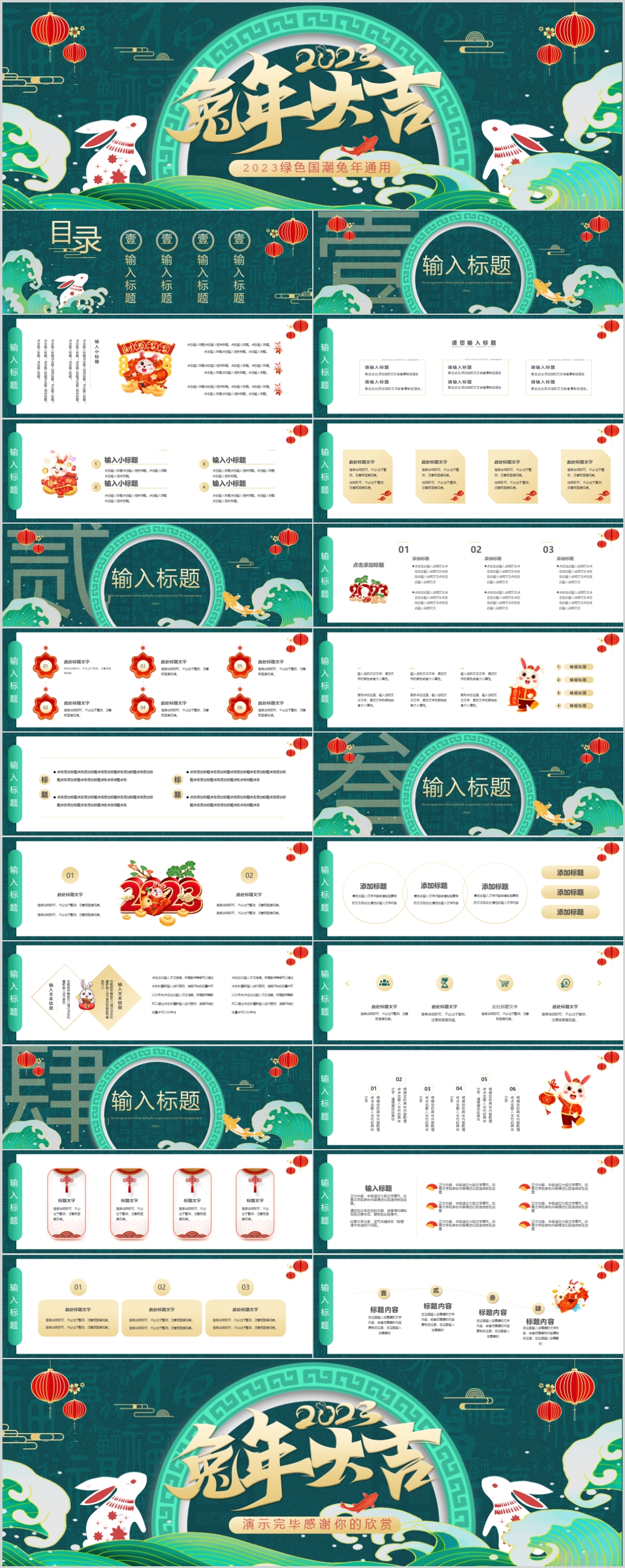 绿色国潮风2023宽屏兔年大吉年终总结新年工作计划通用ppt模板