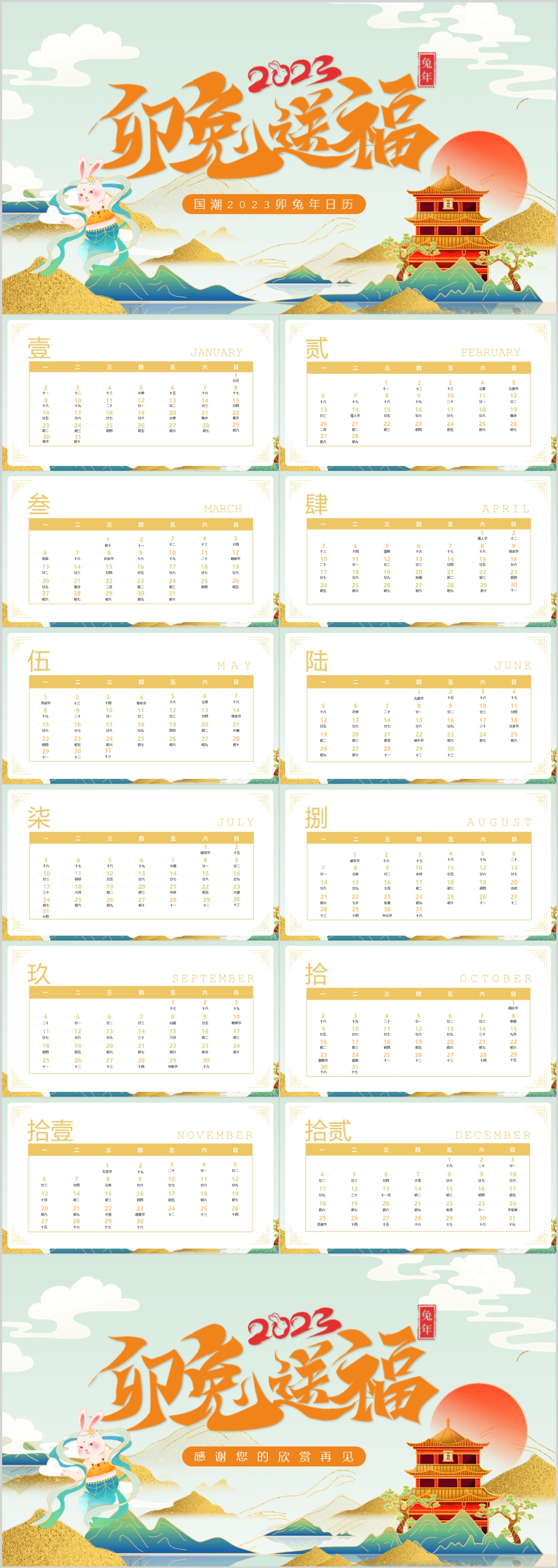 2023年国潮风福兔送福日历挂机台历介绍PPT模板