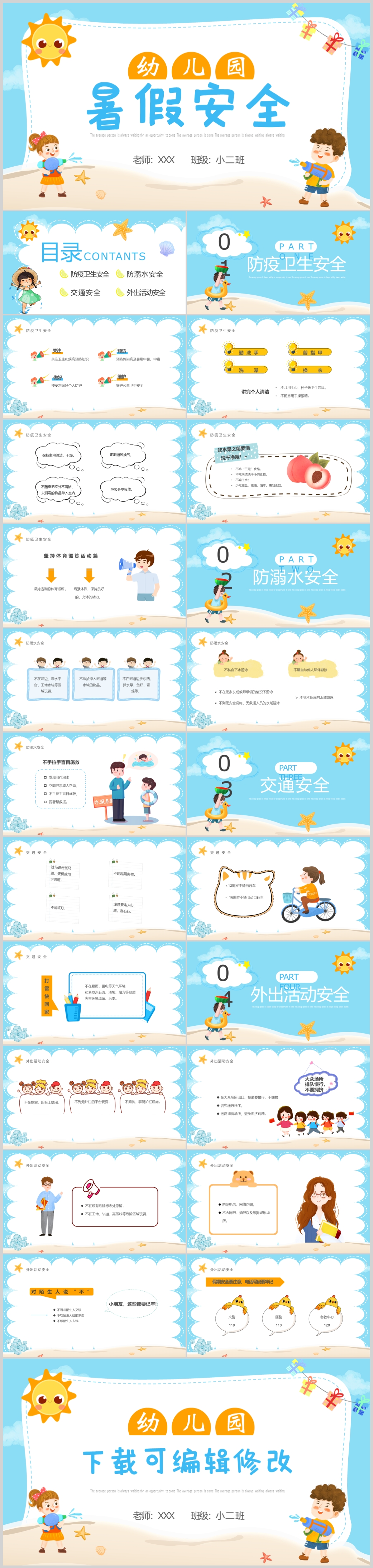 卡通幼儿园中小学生暑假安全知识培训主题课件PPT模板