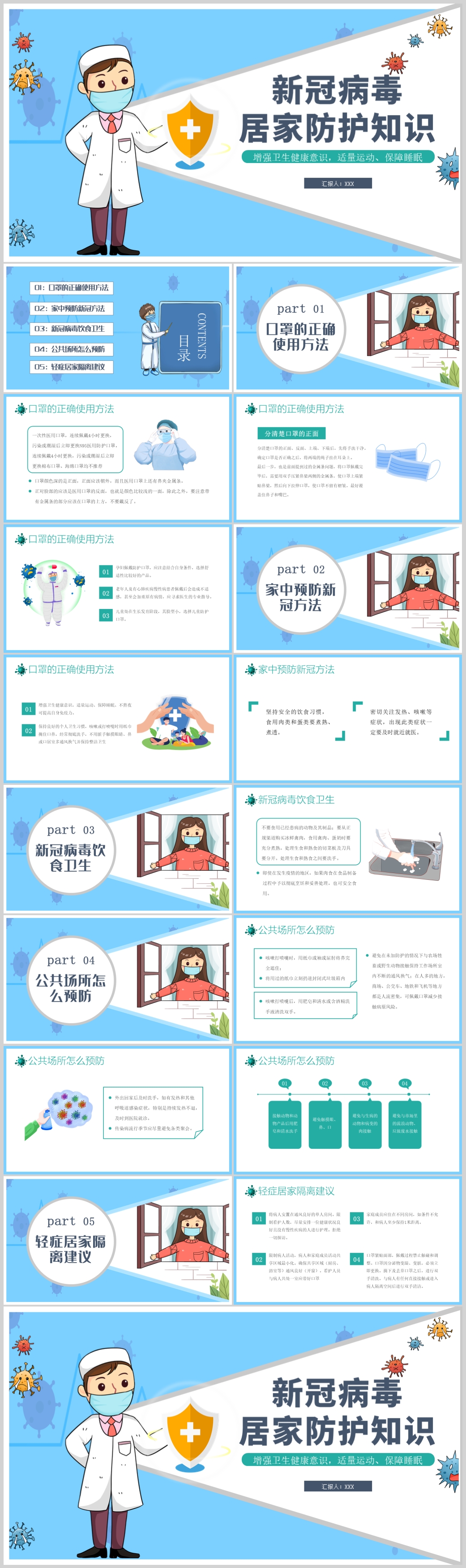 卡通插画风新型冠状病毒居家防护主题班会课件PPT模板