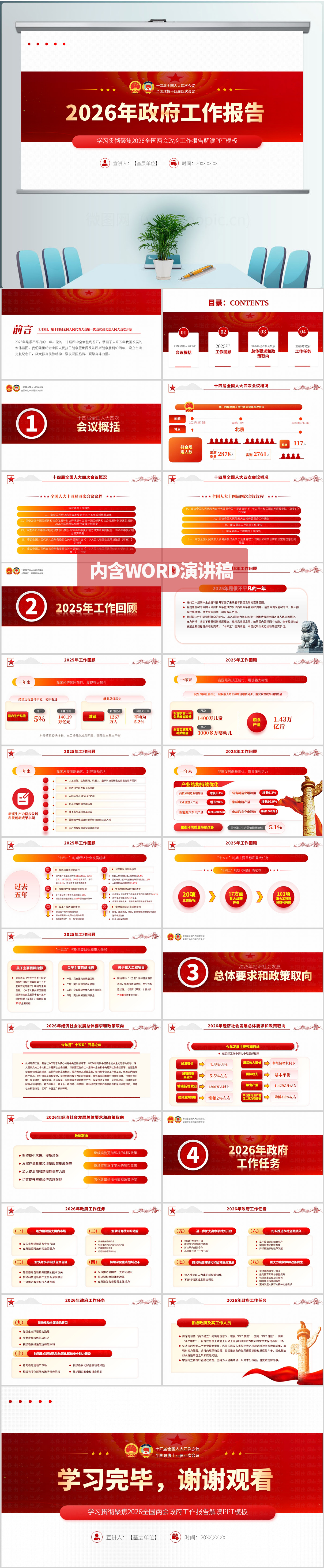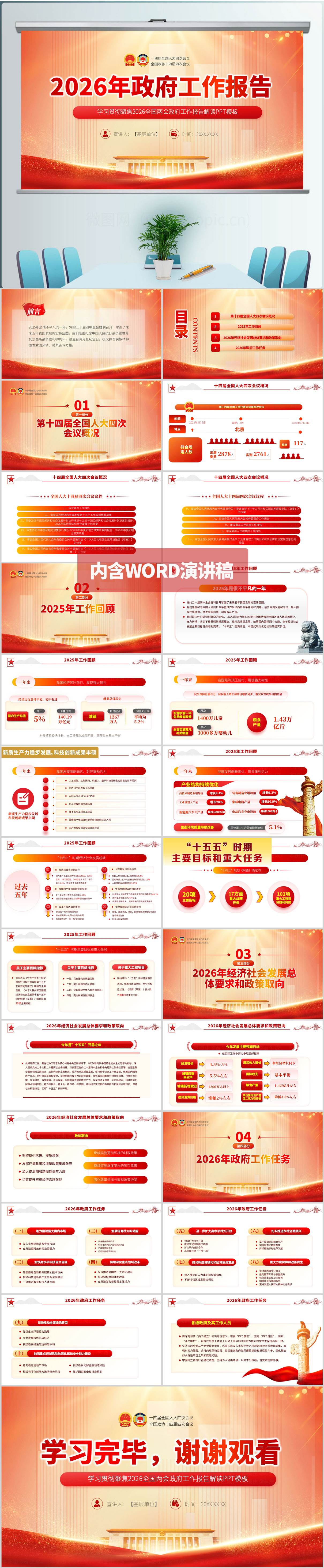 2026政府工作报告学习内容解读ppt模板(内含WORD演讲稿)