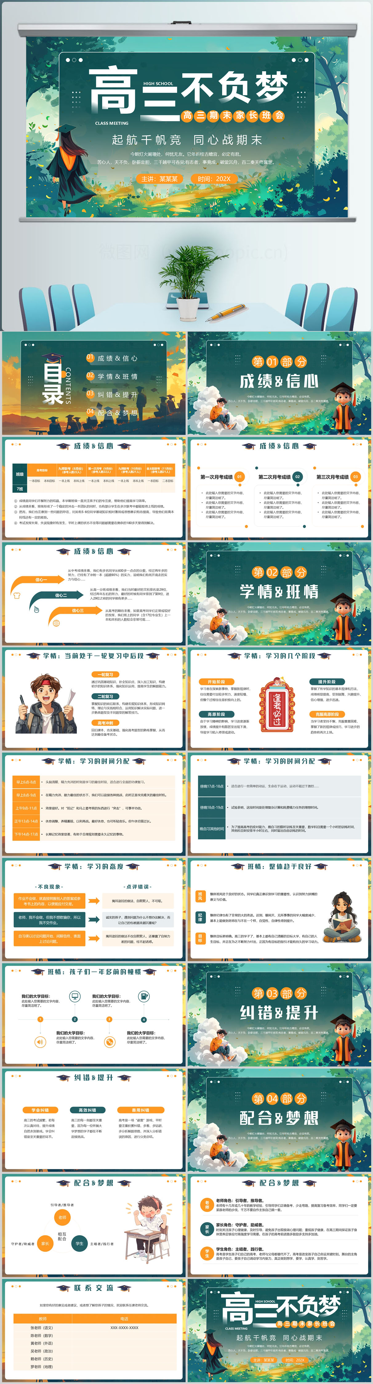 绿色卡通学生期末高三家长座谈会PPT模板设计