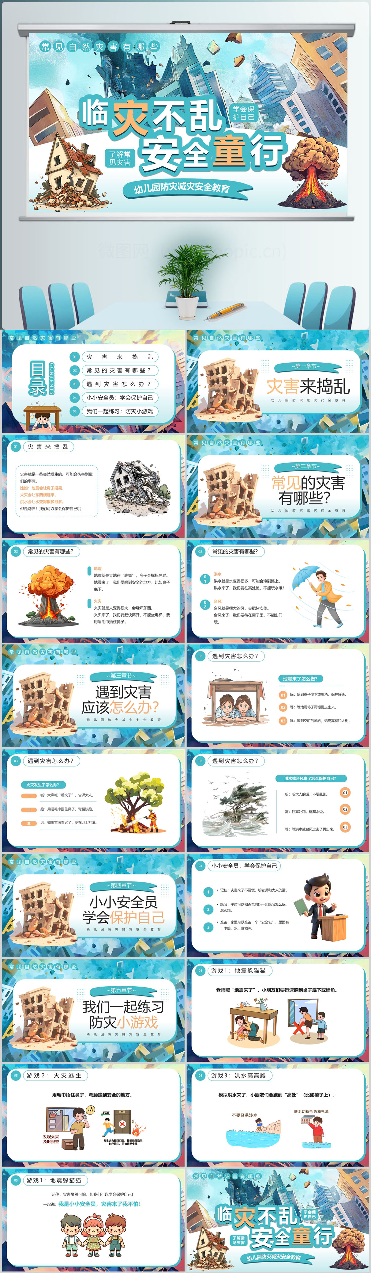 绿色插画风幼儿园防灾减灾安全教育PPT模板设计