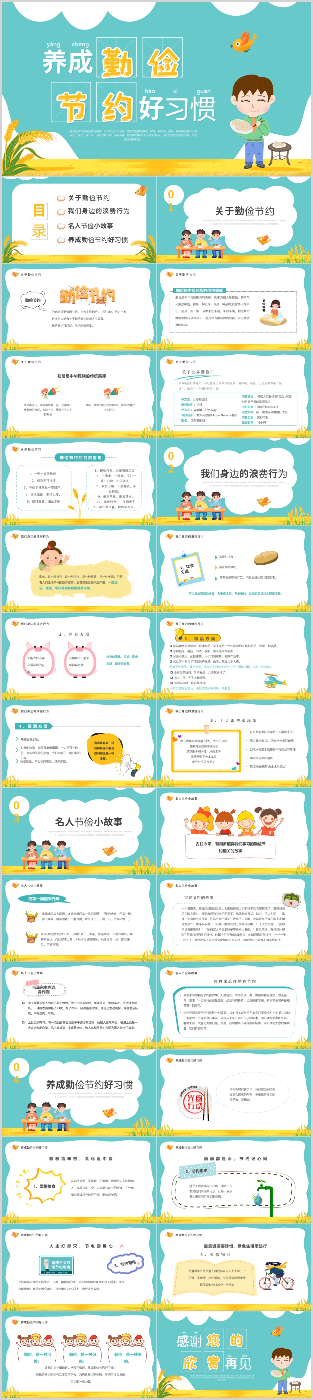 卡通中小学生勤俭节约拒绝浪费主题班会课件P