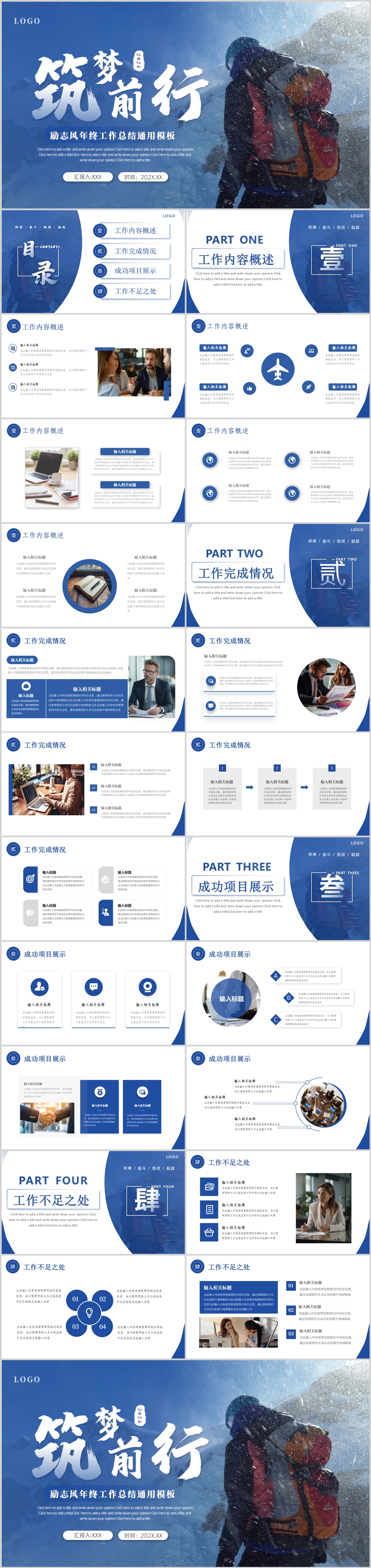 2024蓝色筑梦前行励志商务风年终工作总结PPT模板