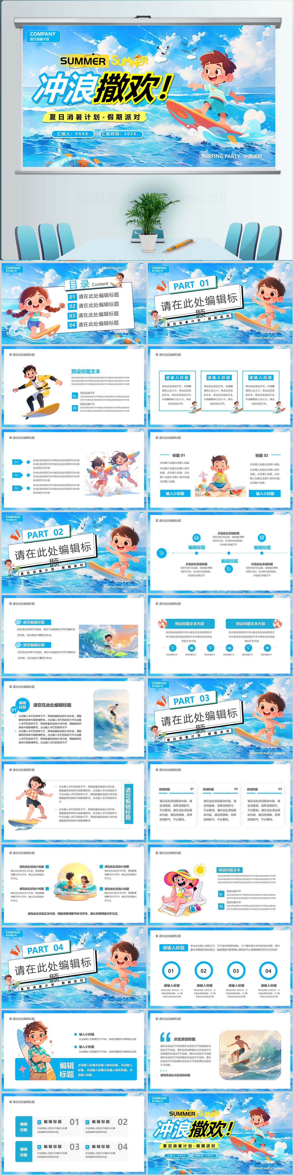 蓝色插画风夏日消暑计划PPT通用模版设计