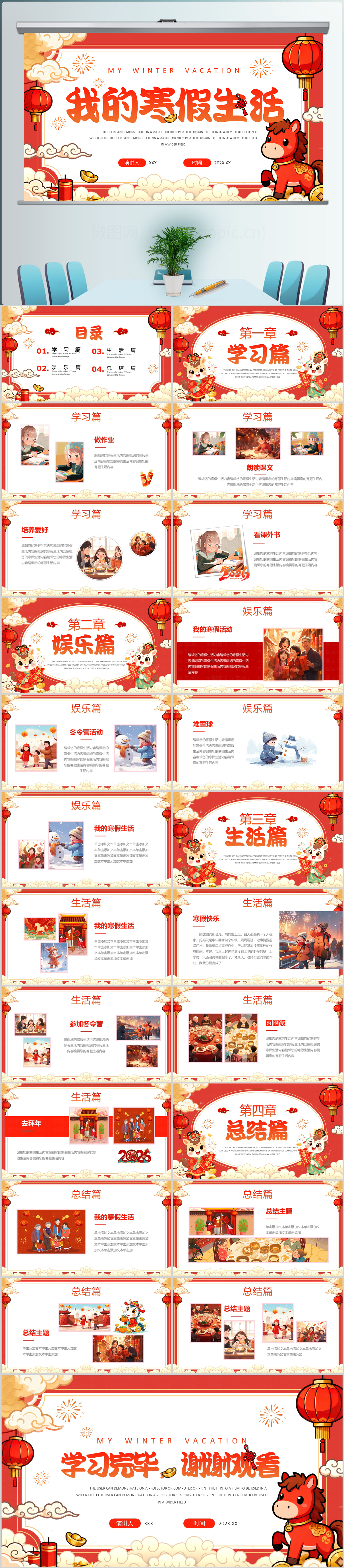 2026卡通马年我的寒假生活介绍ppt模板