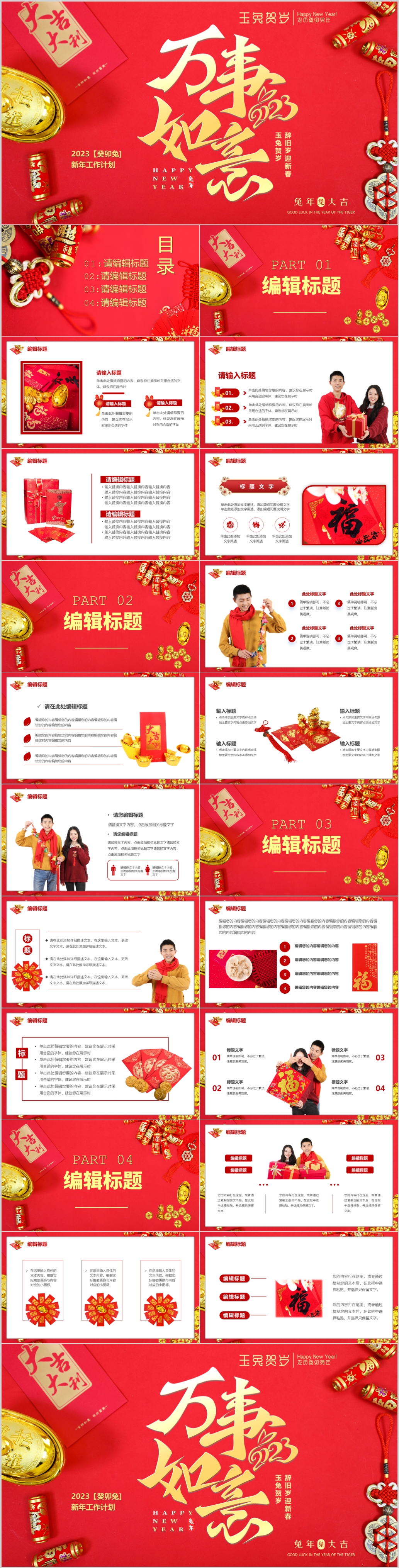2023红色喜庆玉兔贺岁新年工作计划通用PPT模板