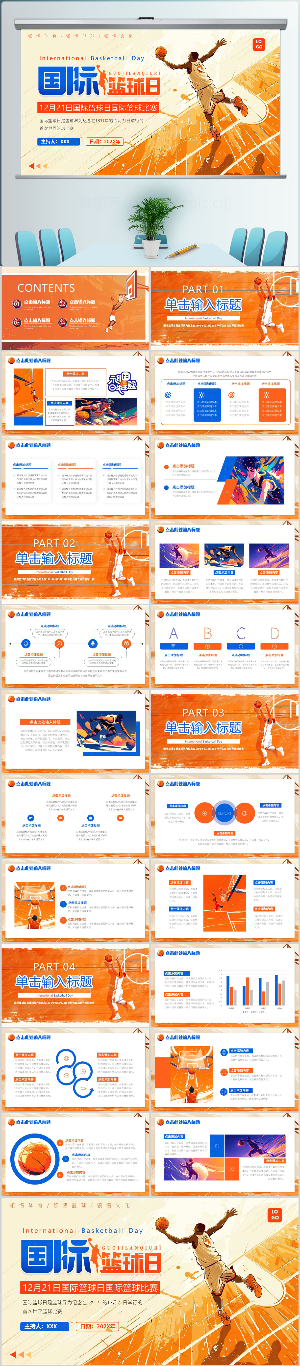 插画风国际篮球日国际篮球比赛PPT模板