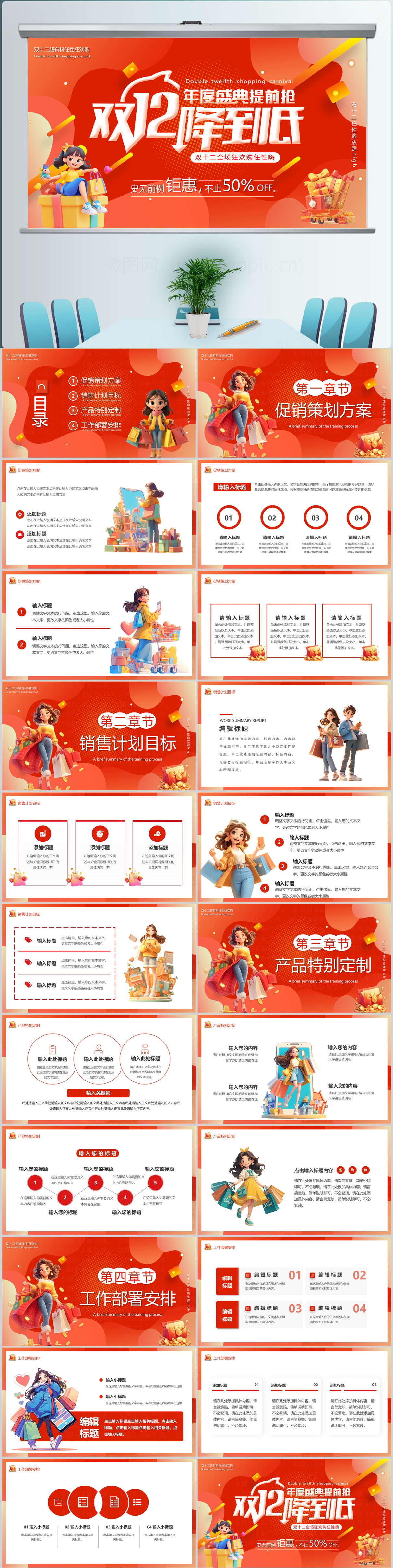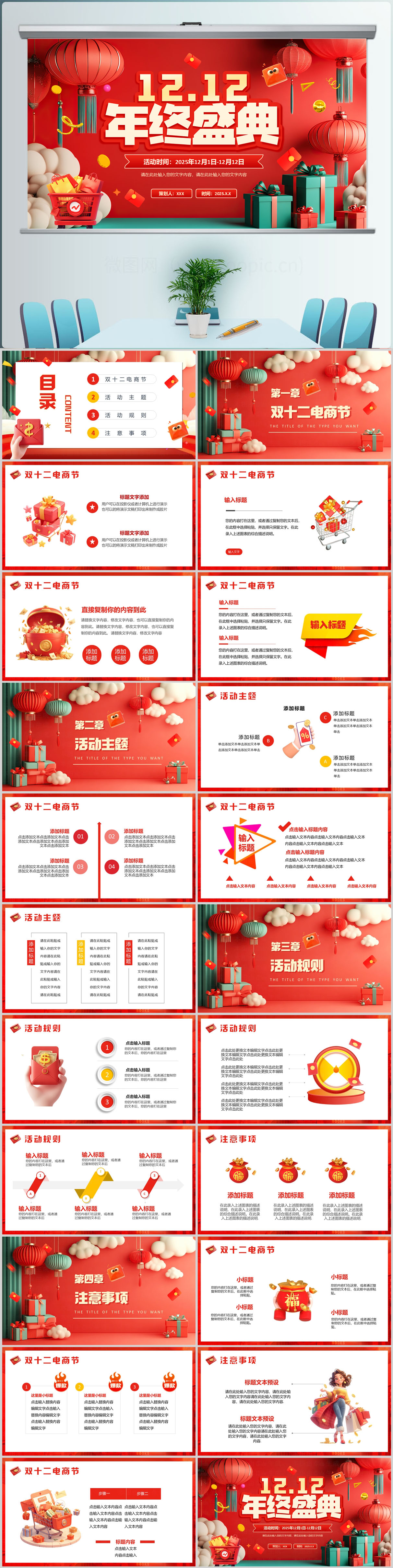 红色双十二全球购物节电商营销数据复盘PPT模版设计