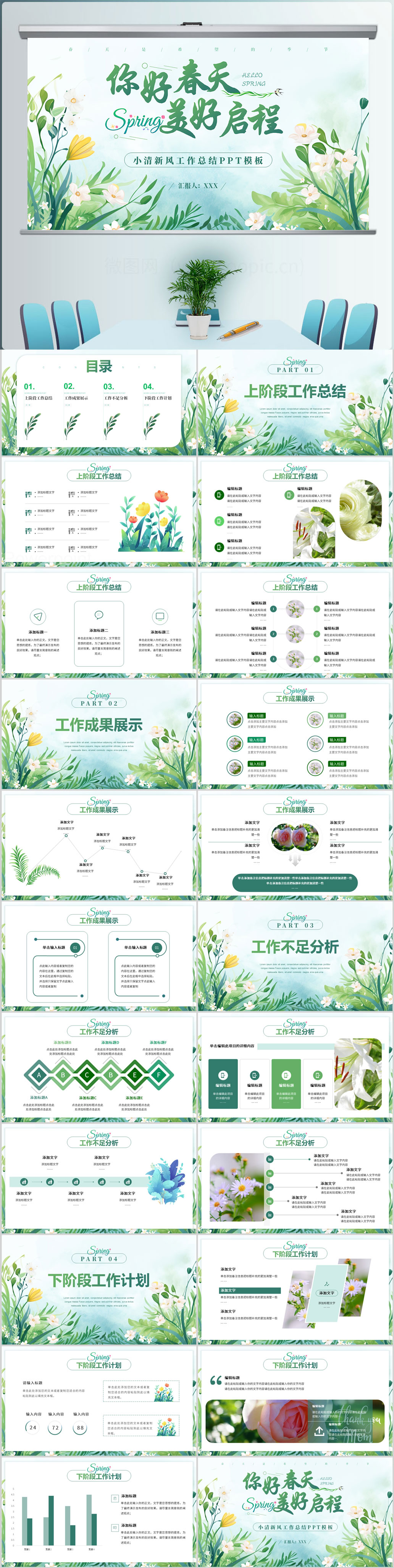 绿色小清新文艺春天你好汇报ppt模板