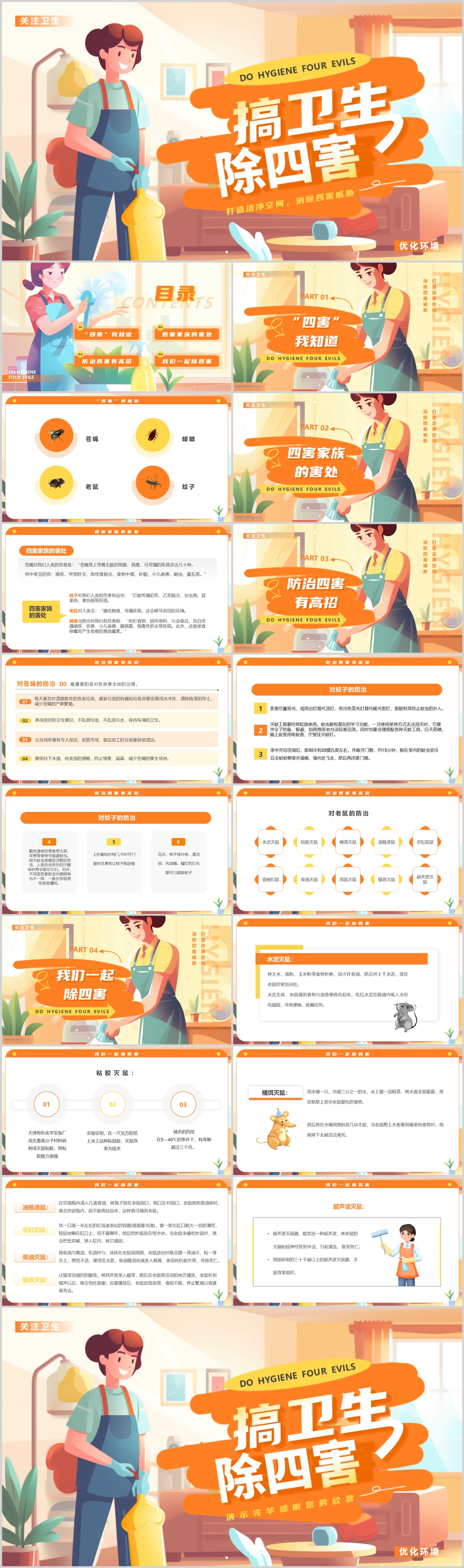 黄色卡通插画搞卫生除四害关爱卫生健康ppt模板