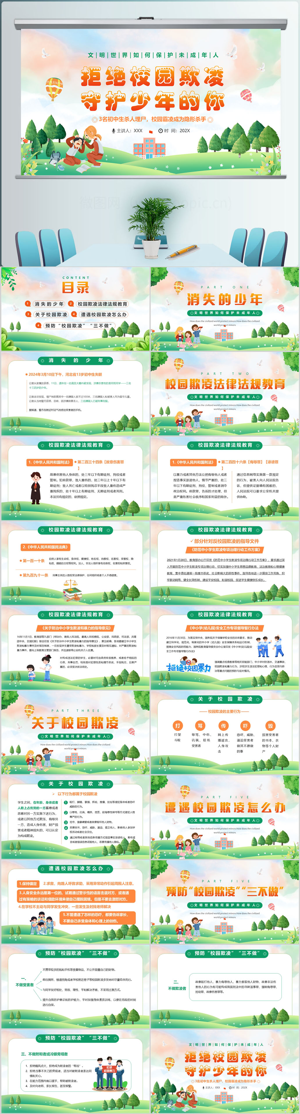 绿色简约风拒绝校园欺凌教育主题PPT模板