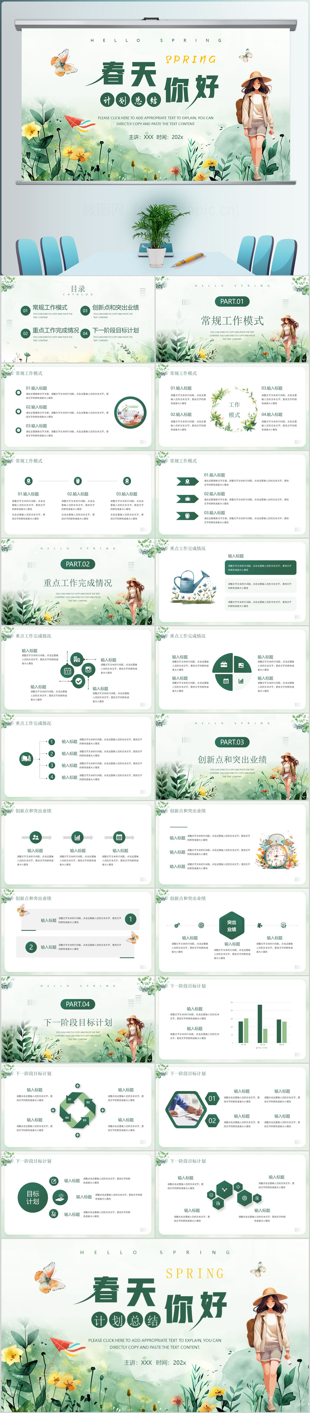 绿色清新你好春天春季旅游踏青春游工作总结通用ppt模板