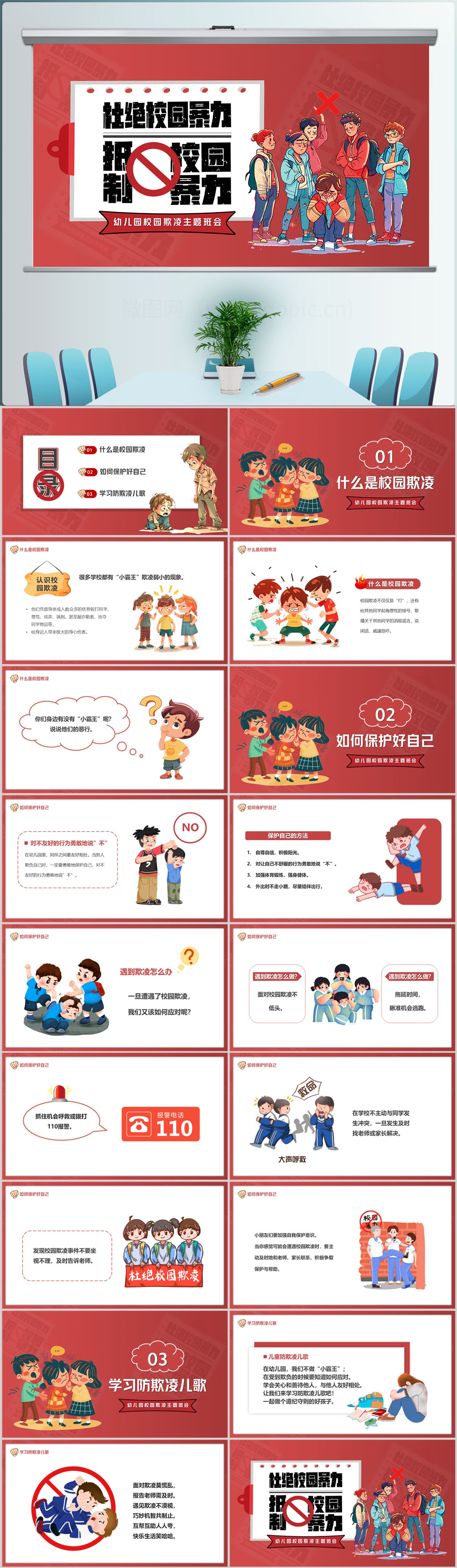 卡通杜绝校园暴力校园安全主题班会ppt模板