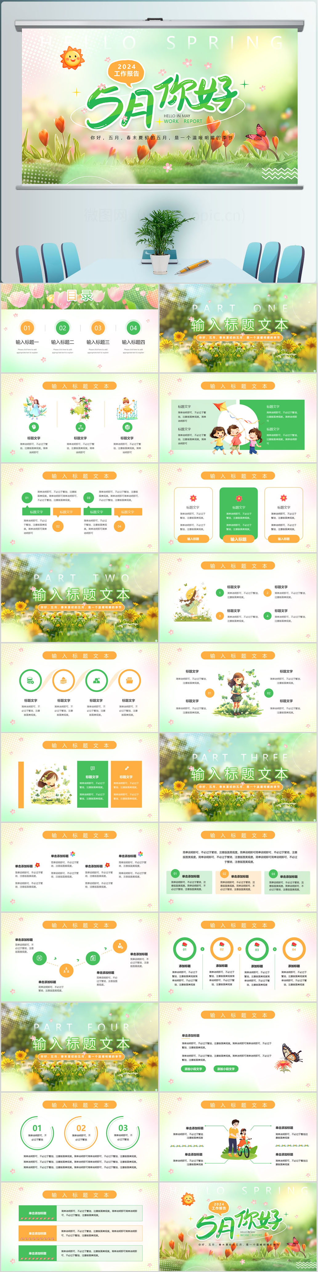 你好五月绿色插画风通用PPT模板