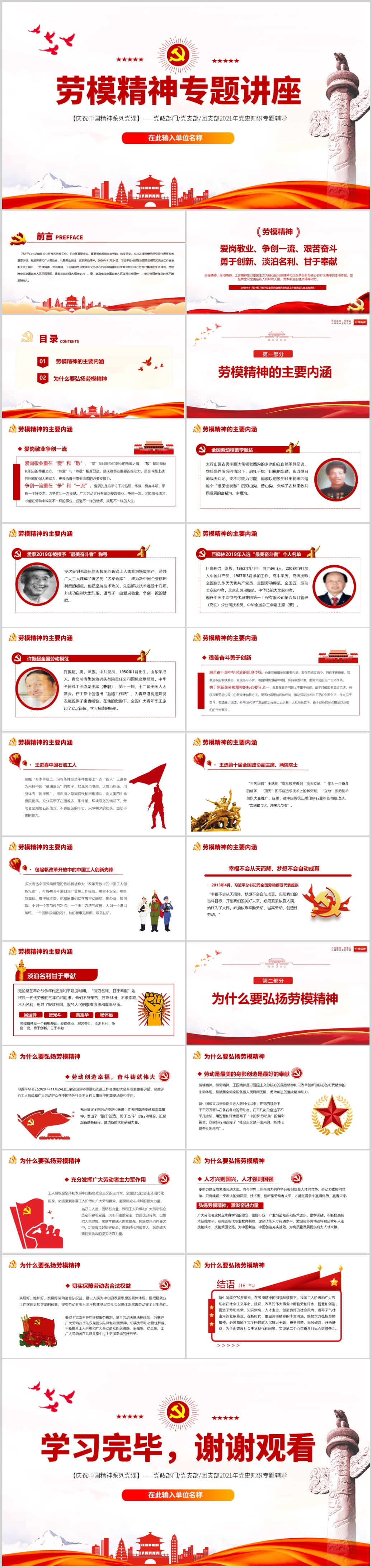 中国精神劳模精神争做榜样专题讲座课件PPT模板(内含WORD演讲稿)