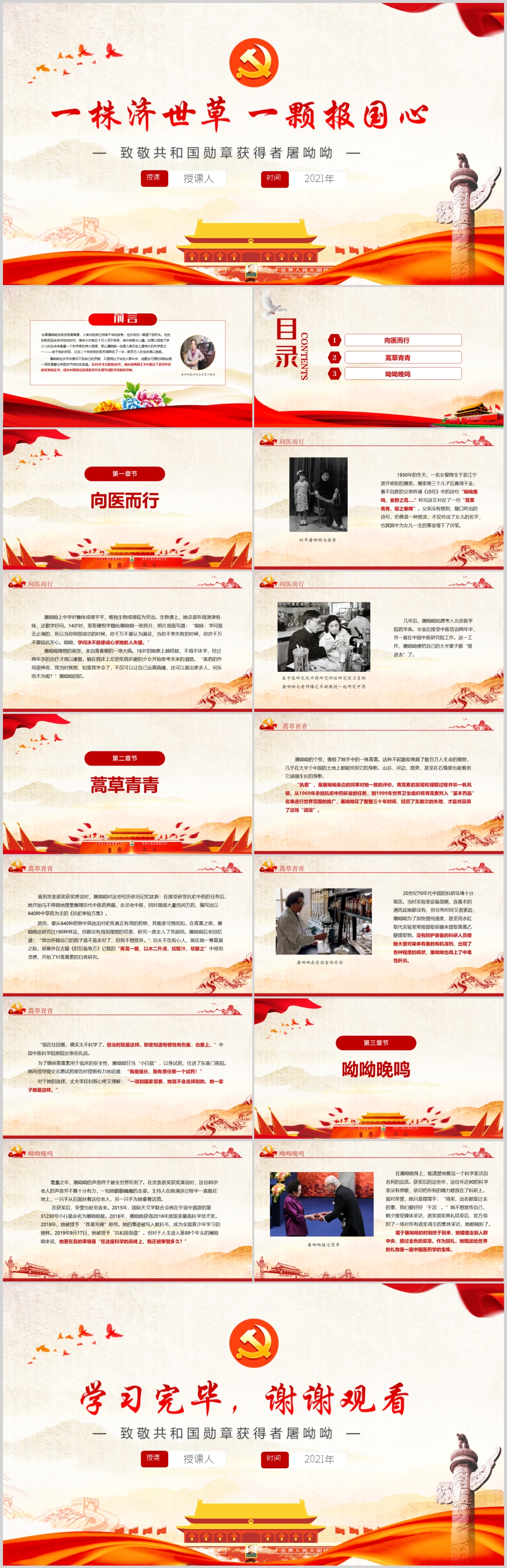 致敬共和国勋章获得者屠呦呦先进模范事迹PPT模板(内含WORD演讲稿)