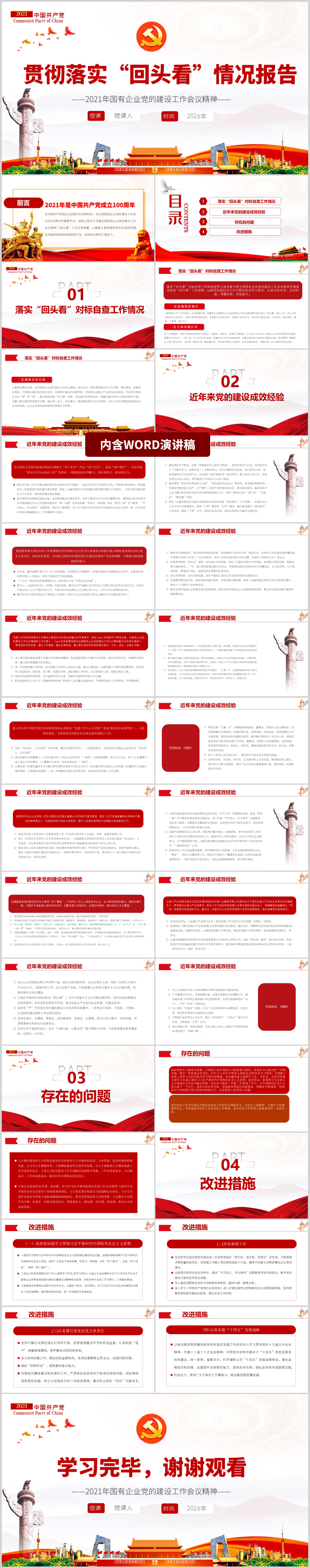 2021国有企业党的建设工作落实回头看会议精神党课PPT模板(内含WORD演讲稿)