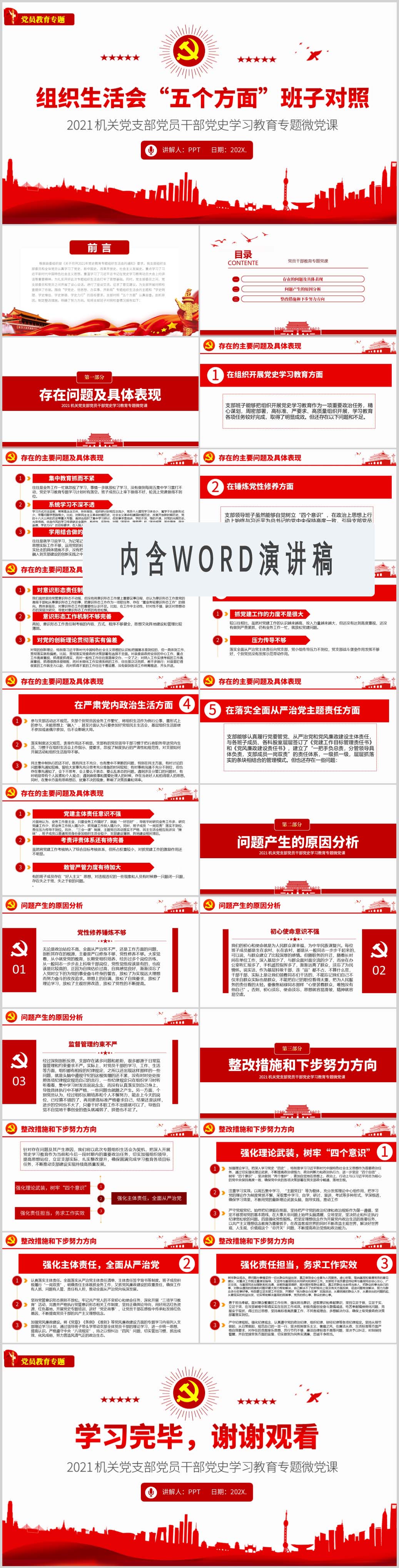 基层党支部党组织生活会“五个方面”班子对照党课PPT模板(内含WORD演讲稿)