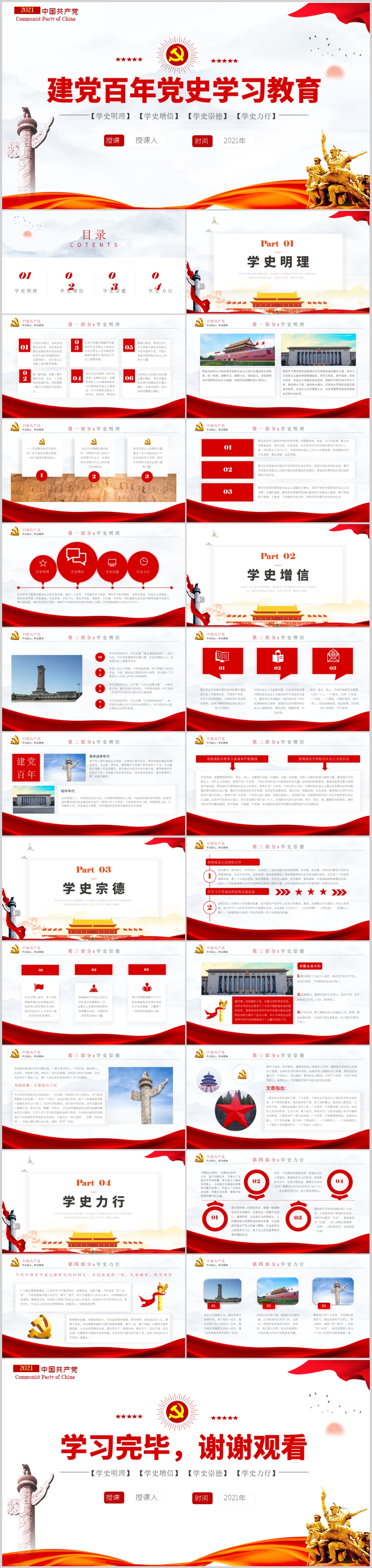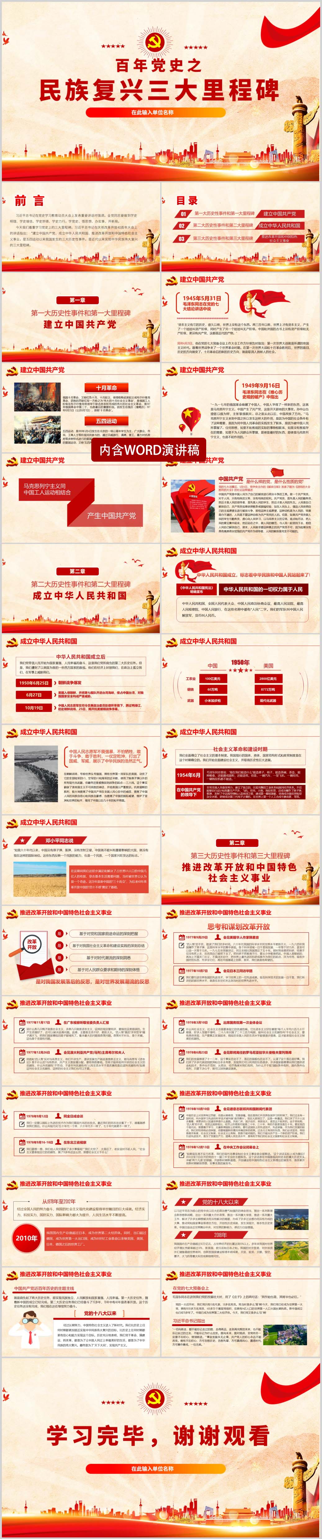 七一建党节百年党史之三大里程碑党史学习教育党课PPT模板(内含WORD演讲稿)