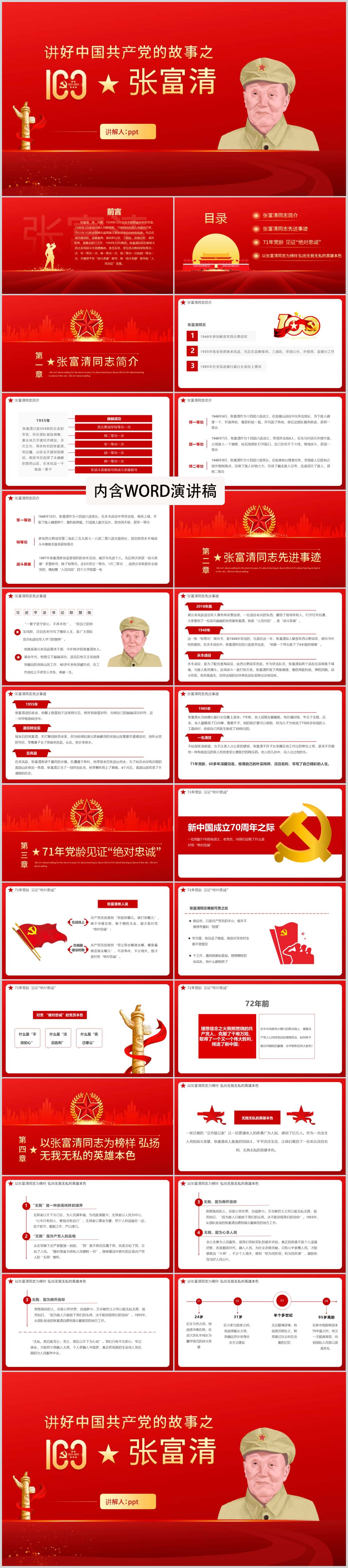 红色七一建党讲好中国共产党的故事张富清党史党课PPT模板(内含WORD演讲稿)