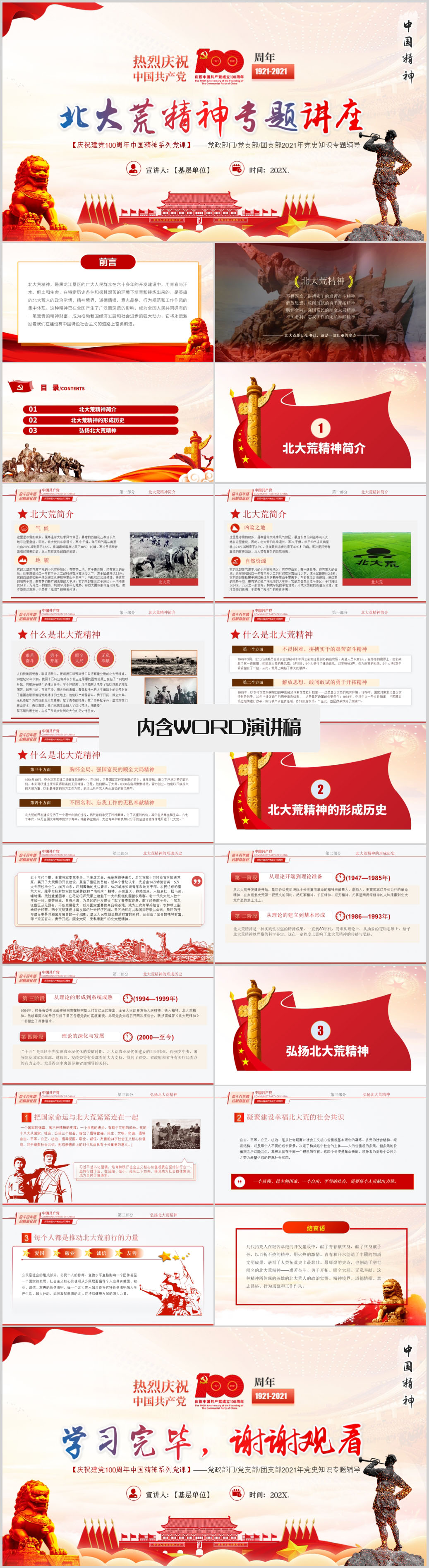 七一建党节北大荒精神党史学习教育党课PPT模板(内含WORD演讲稿)