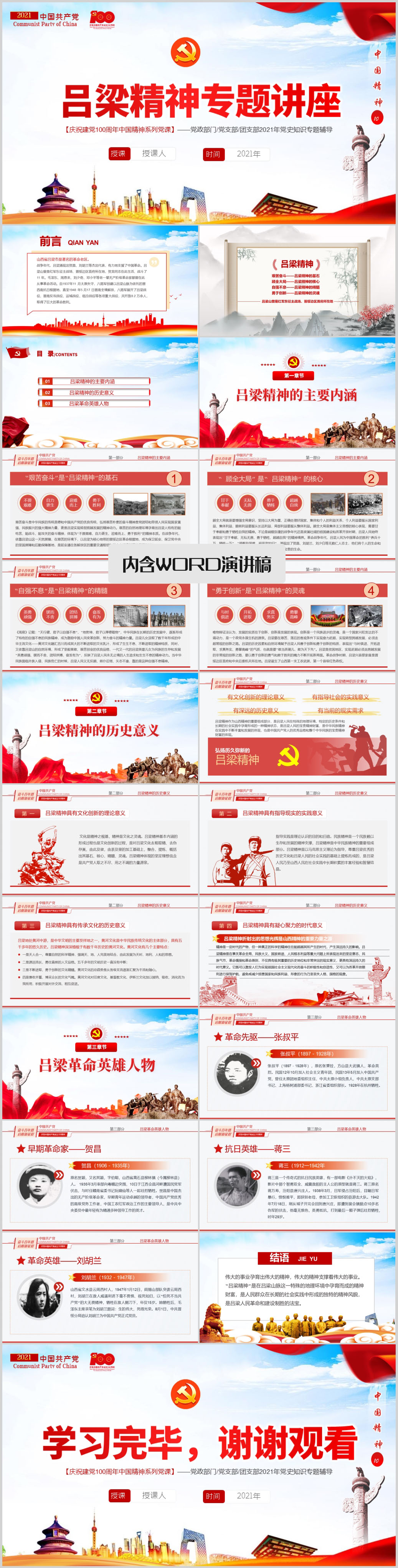 七一建党史吕梁精神党史学习教育党课PPT模板(内含WORD演讲稿)