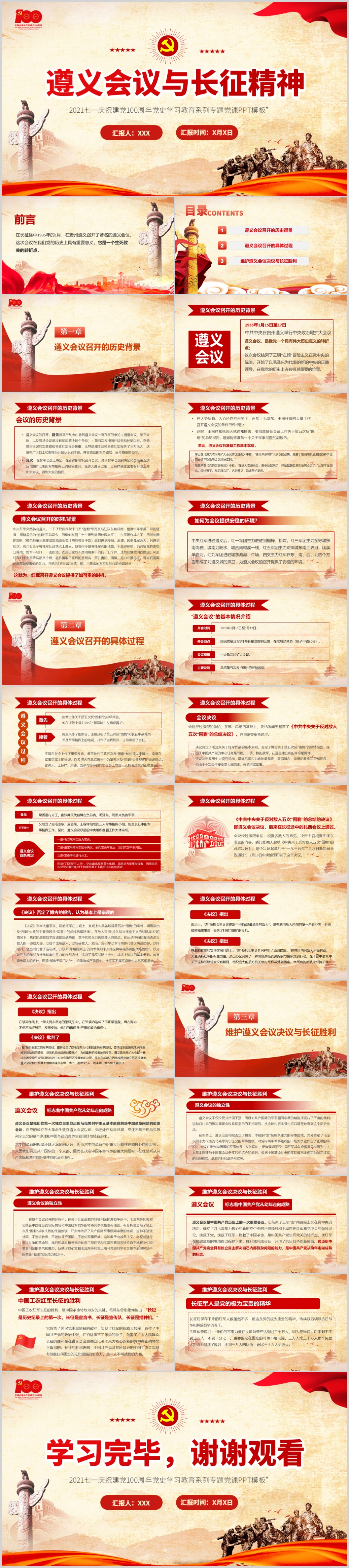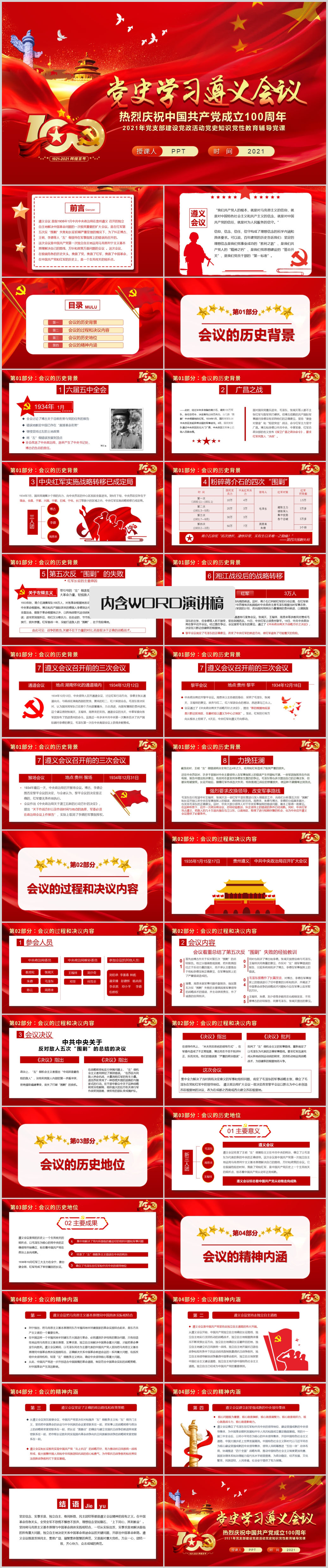 七一建党史遵义会议党史学习教育专题党课PPT模板(内含WORD演讲稿)
