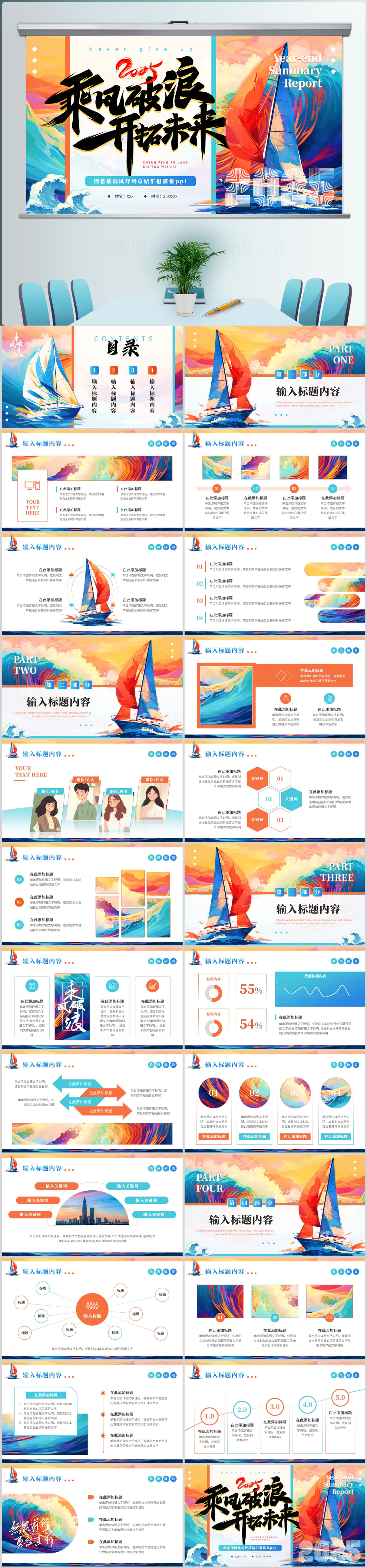 乘风破浪书法商务办公室年终工作总结ppt模板设计