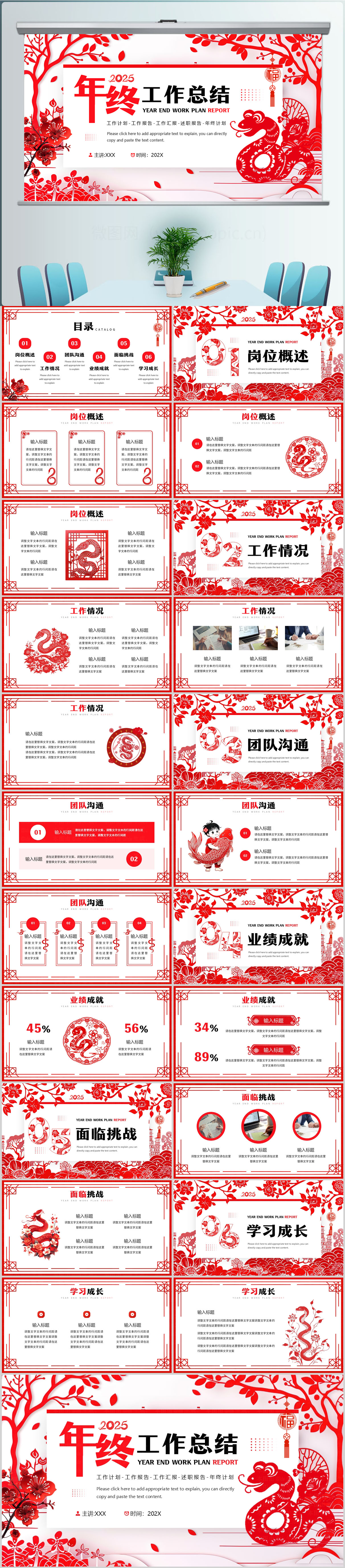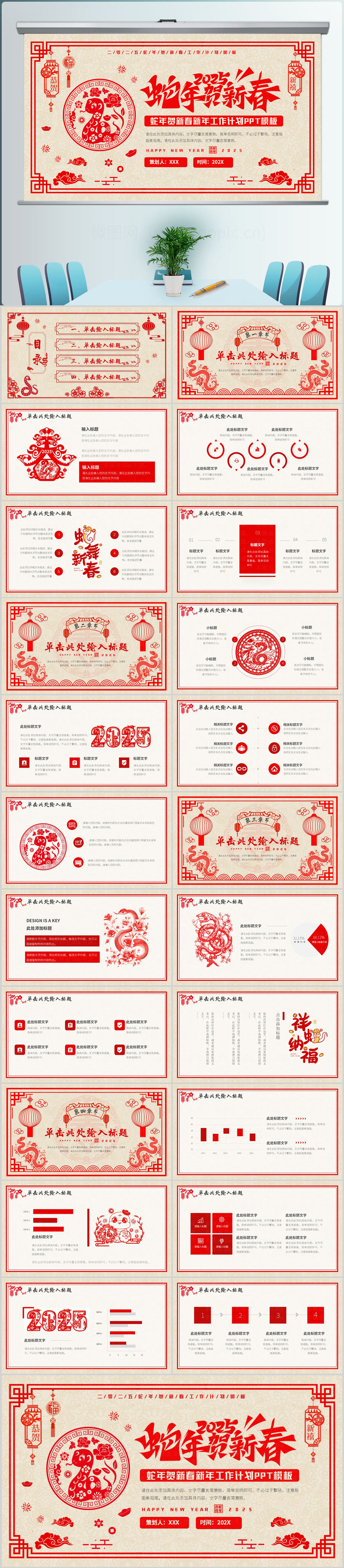 2025年剪纸蛇年年终总结工作计划PPT模版设计