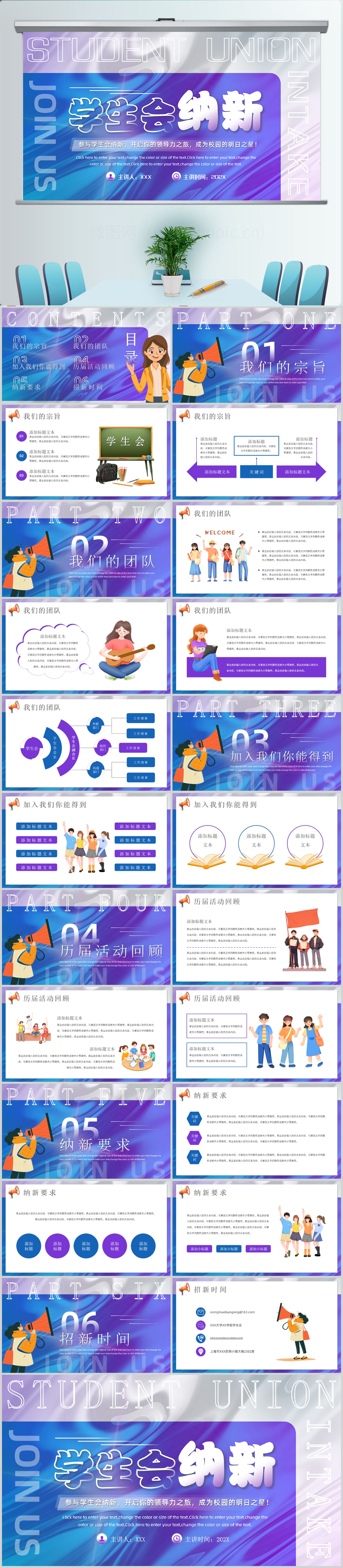 紫色卡通校园学生会招新纳新PPT模板设计