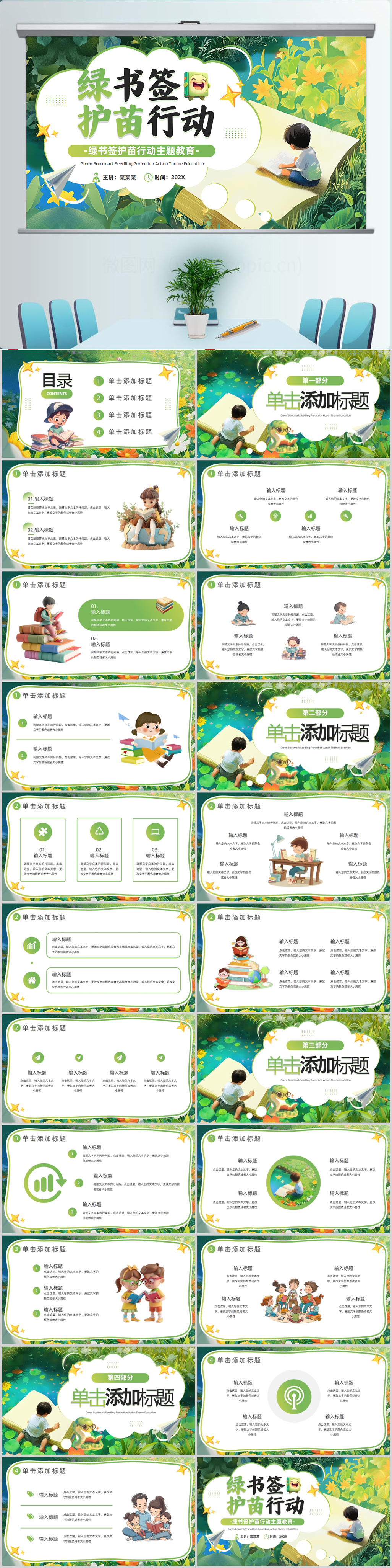 绿色卡通风绿书签护苗行动主题教育通用PPT模板设计