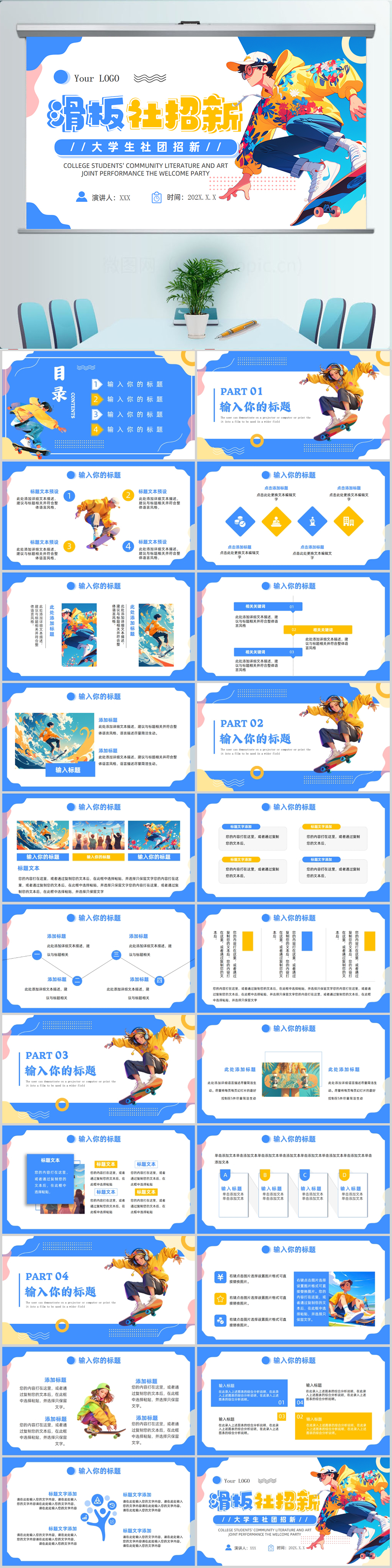 新大学轮滑社团招新学生会招新社团宣传通用ppt模板设计