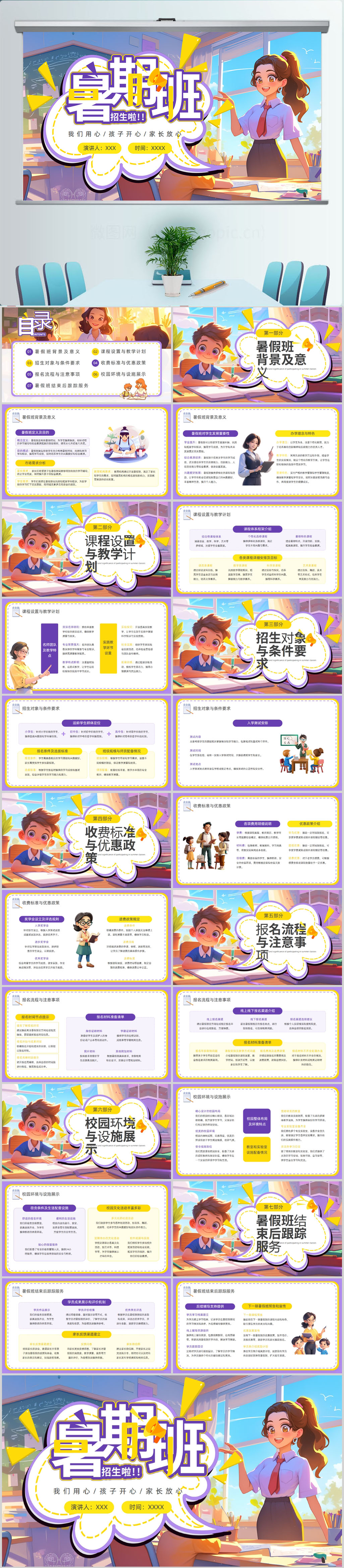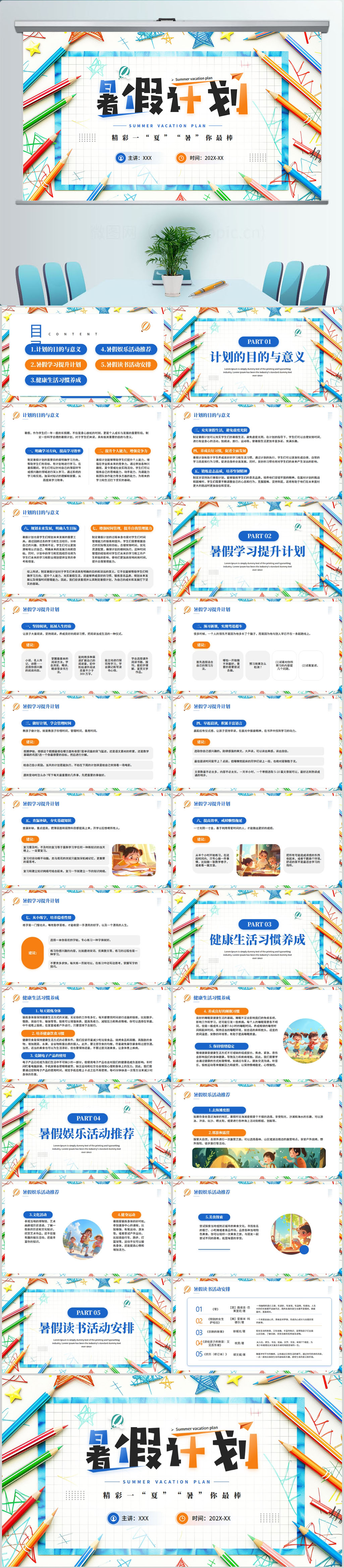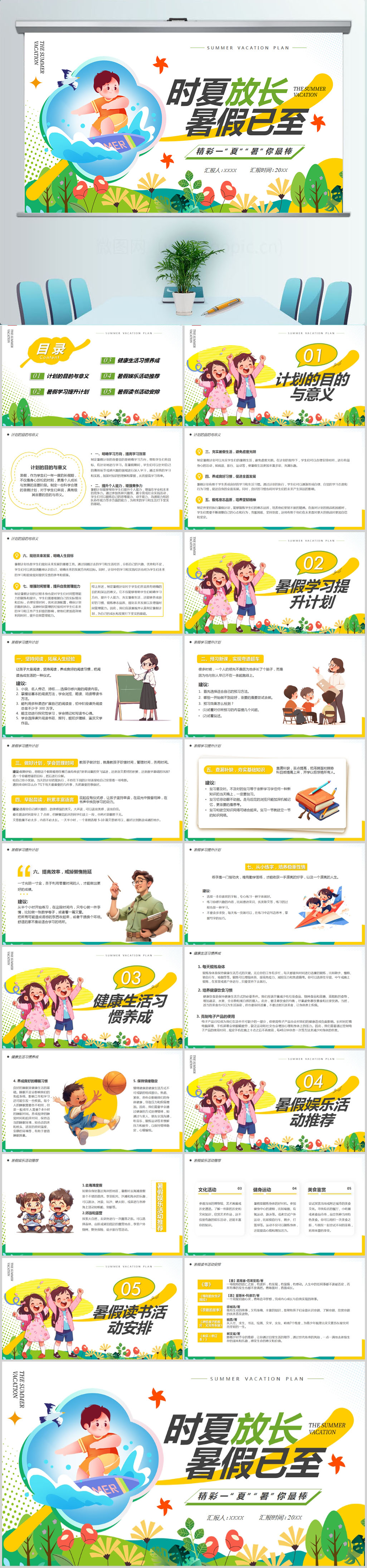 卡通清新小学生快乐暑假假期生活计划PPT模板设计