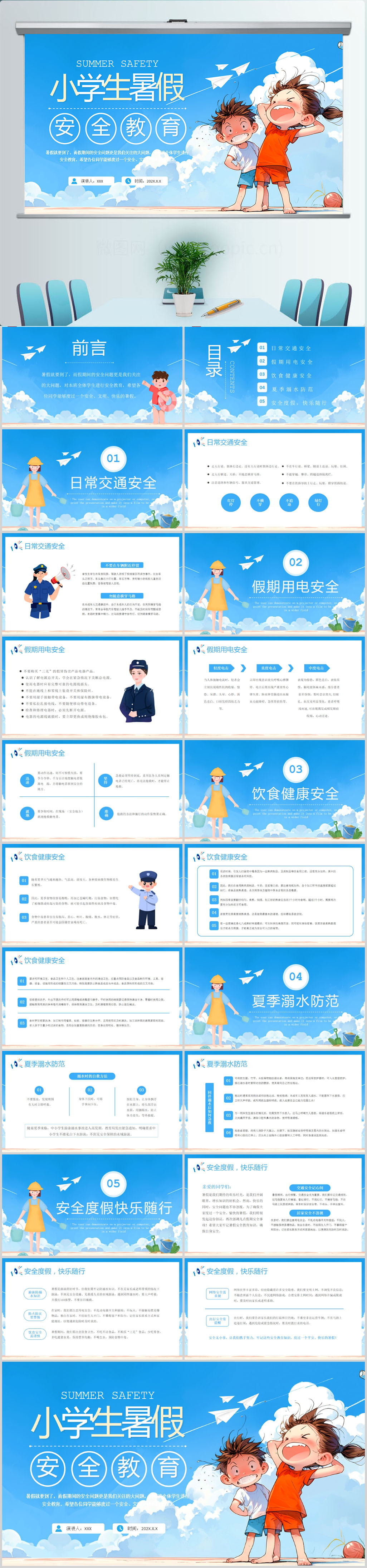 蓝色卡通幼儿园中小学暑假安全教育PPT模版设计