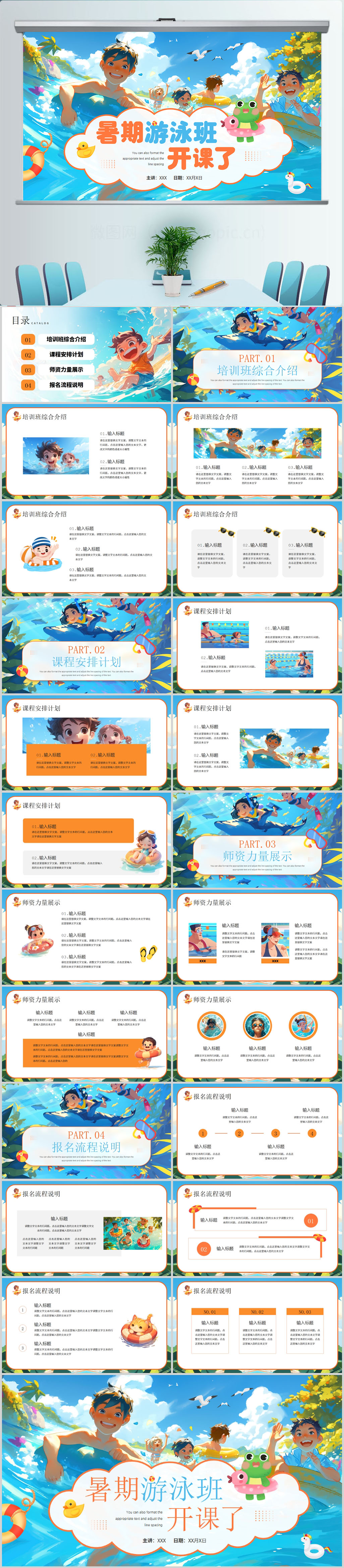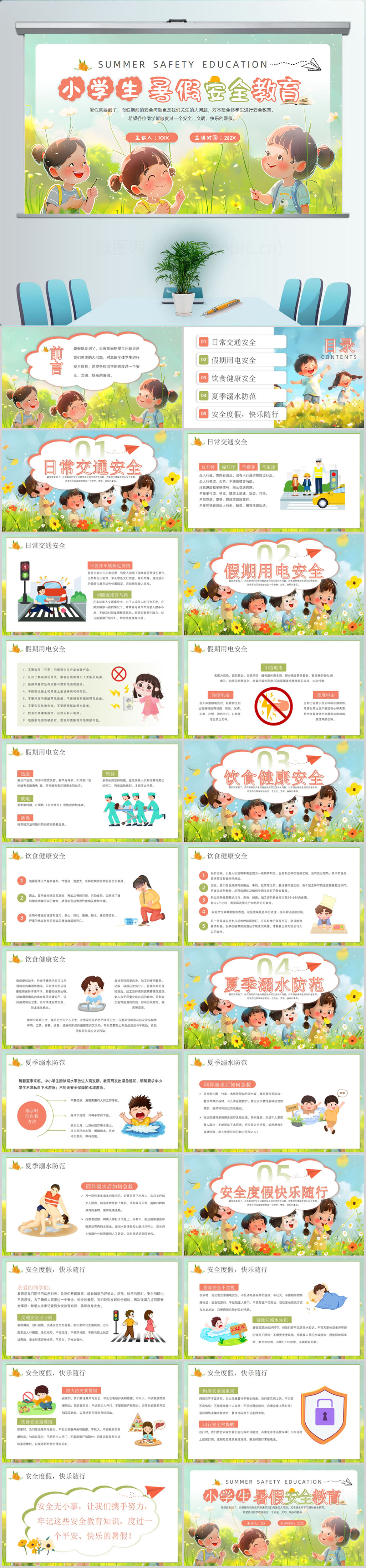 卡通清新校园安全暑假防溺水主题班会ppt模版设计