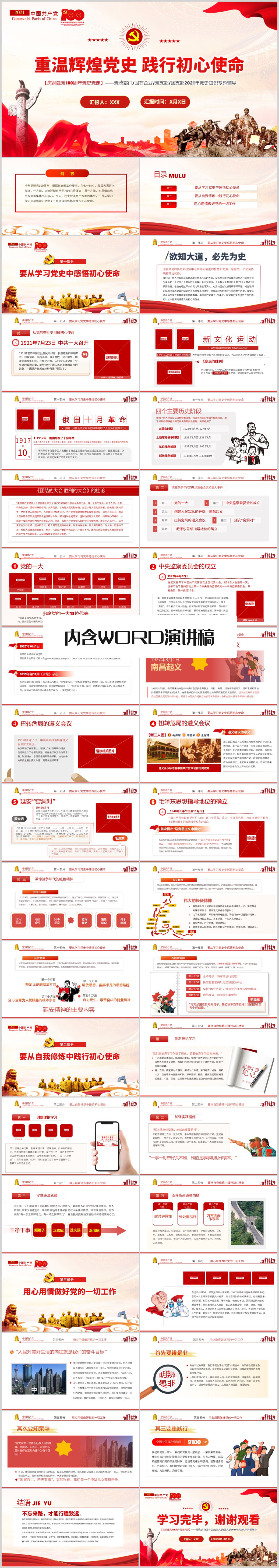 七一建党100周年辉煌党史中感悟初心使命党课PPT模板(内含WORD演讲稿