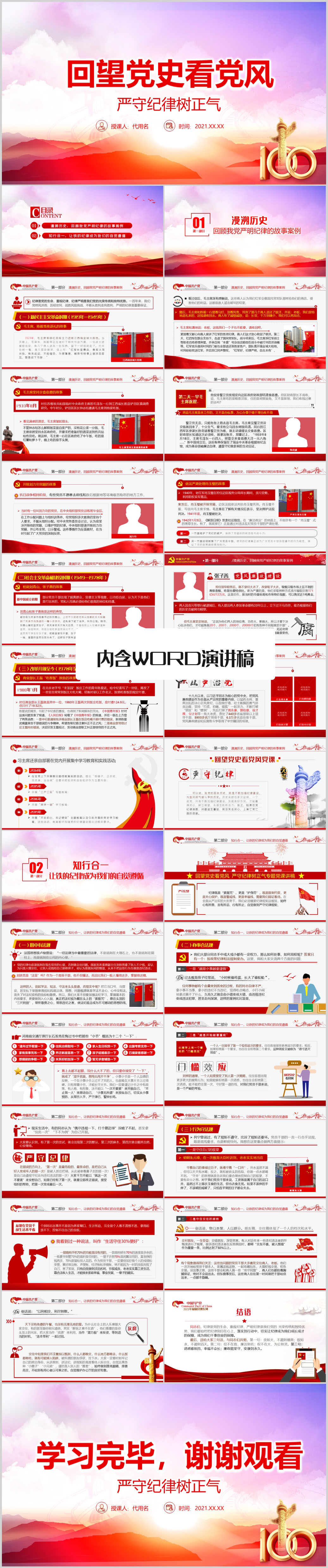 回望党史看党风严守纪律树正气廉政教育党课PPT模板(内含WORD演讲稿)