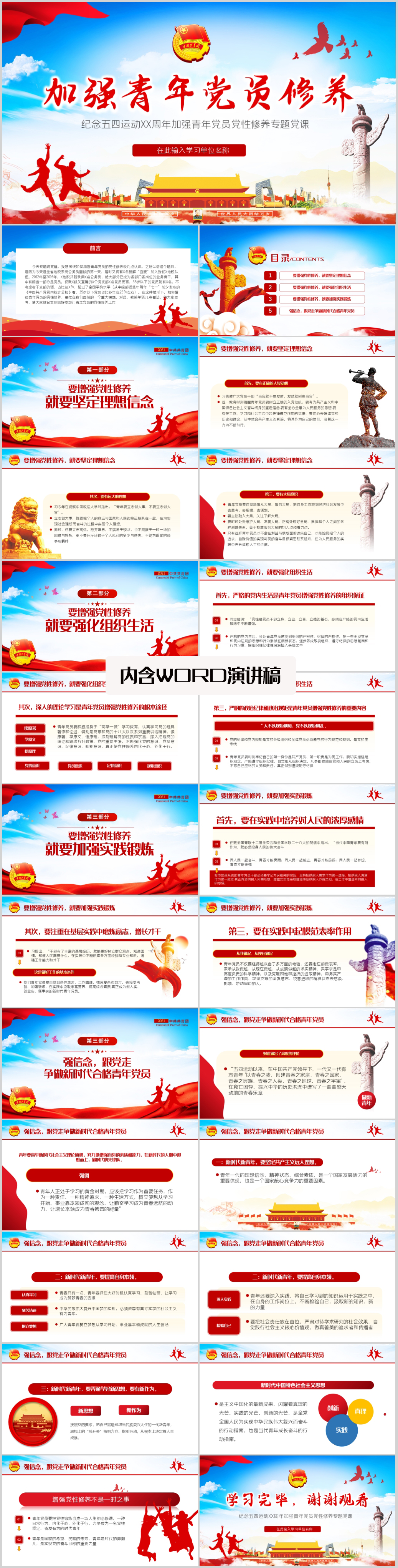 纪念五四运动102周年加强青年党员党性修养专题团课PPT模板(内含WORD演讲稿)