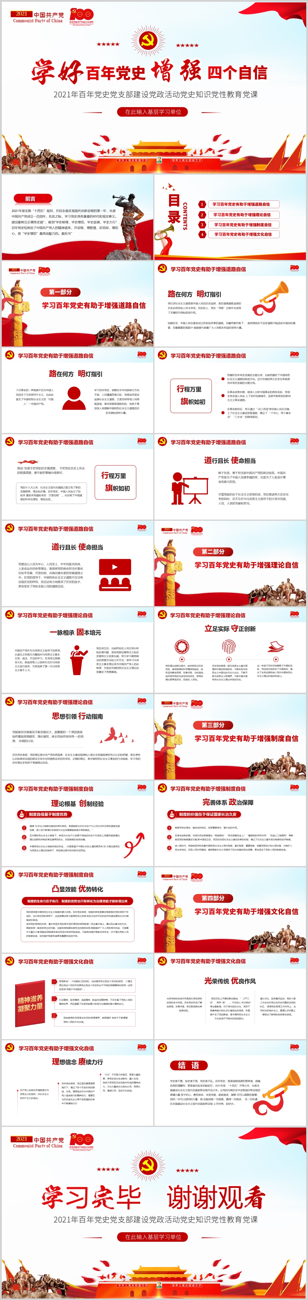 建党100周年以百年党史学习助力“四个自信”党课ppt模板