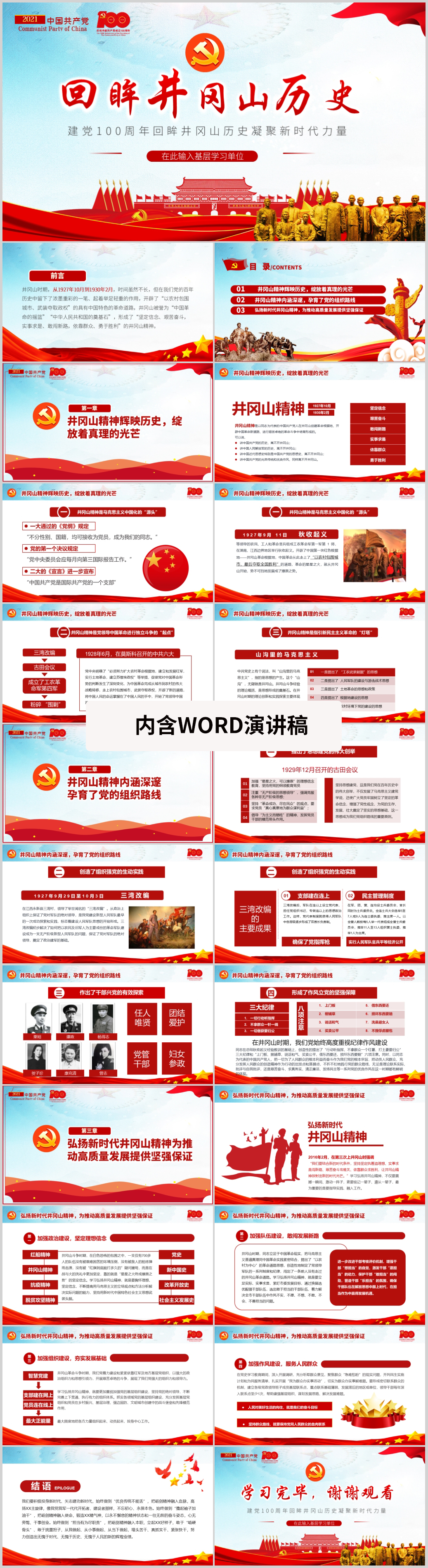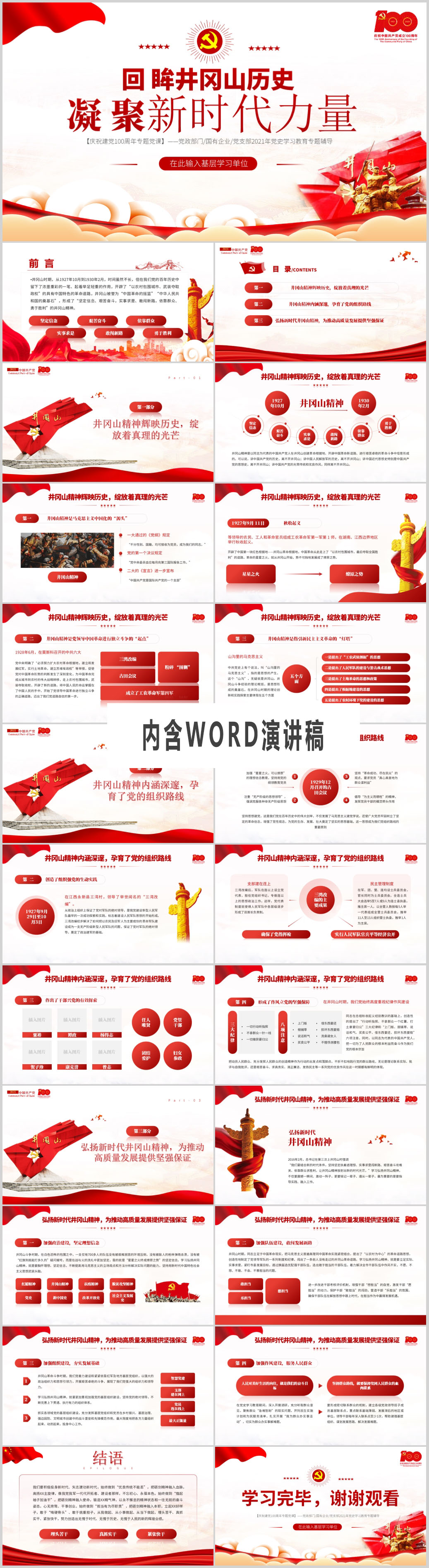 七一建党百年党史学习教育井冈山精神党课ppt模板(内含WORD演讲稿)