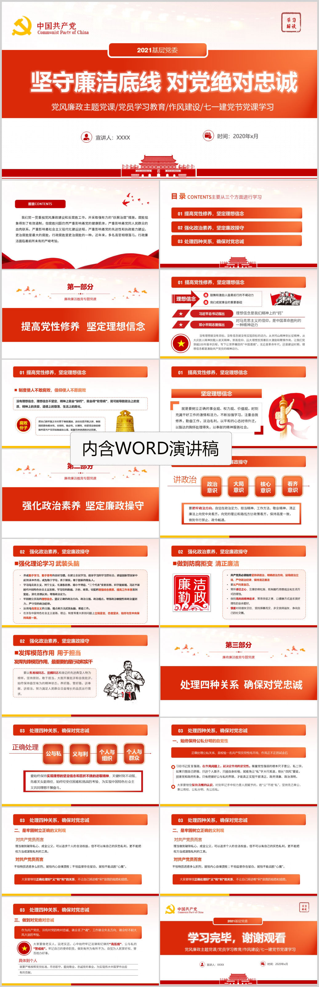 2021年坚守廉洁底线对党忠诚党风廉政主题党课PPT模板(内含WORD演讲稿)