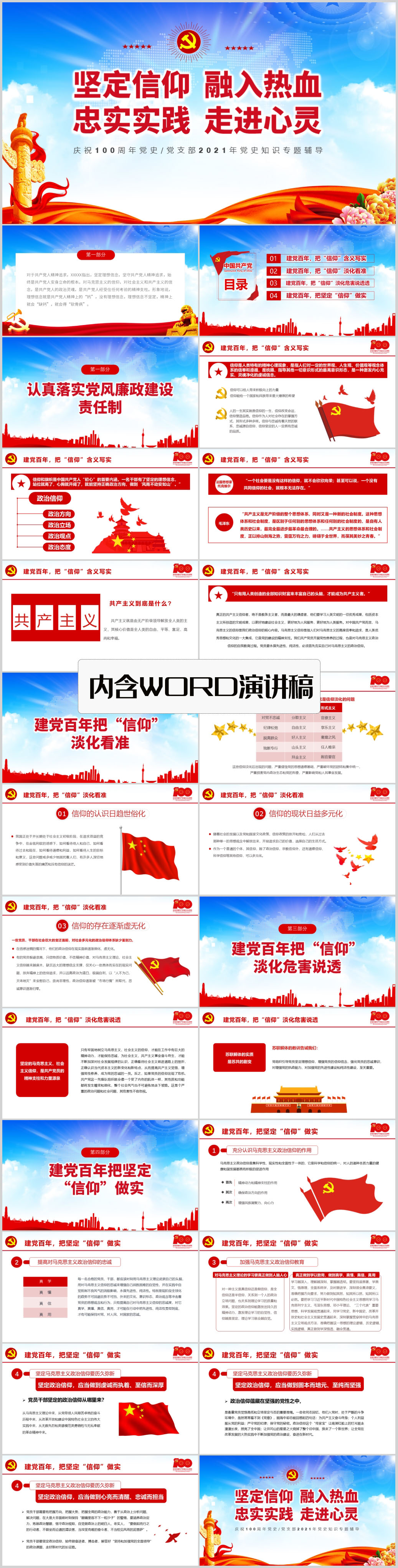 坚定信仰融入热血忠实实践走进心灵建党百年党课PPT模板(内含WORD演讲稿)