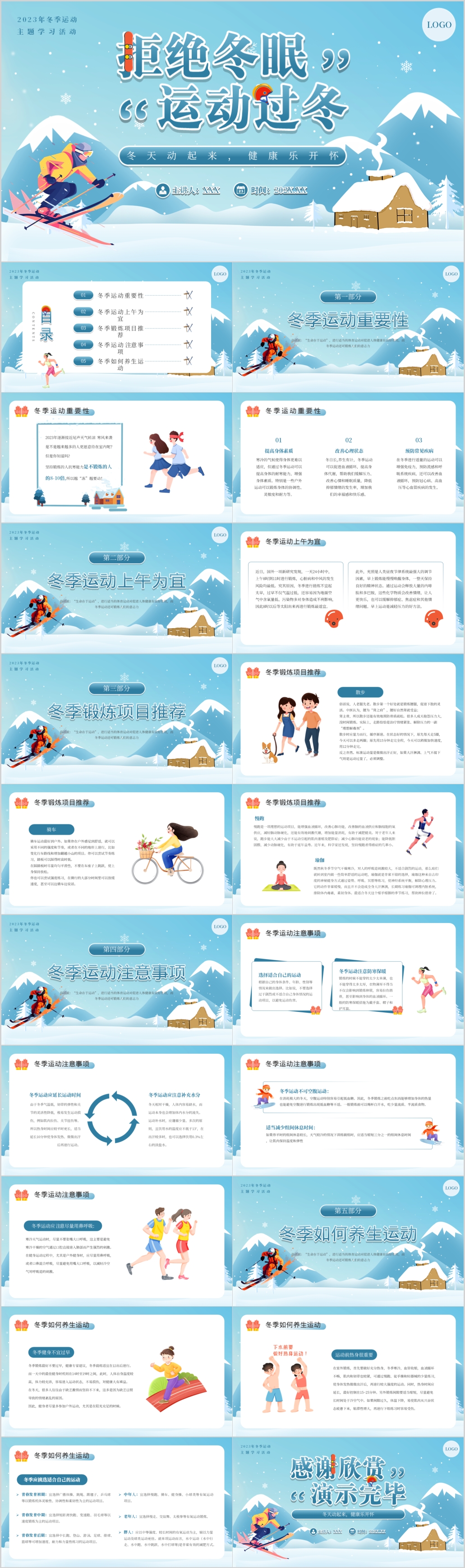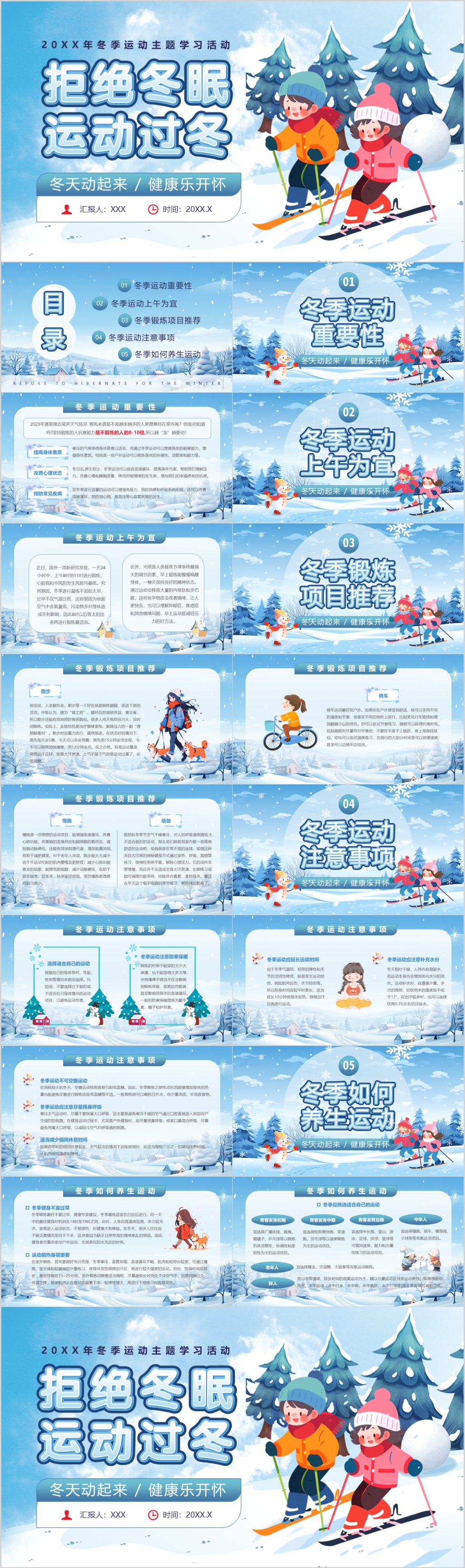 卡通蓝色拒绝冬眠运动过冬冬季运动安全主题班会ppt模板