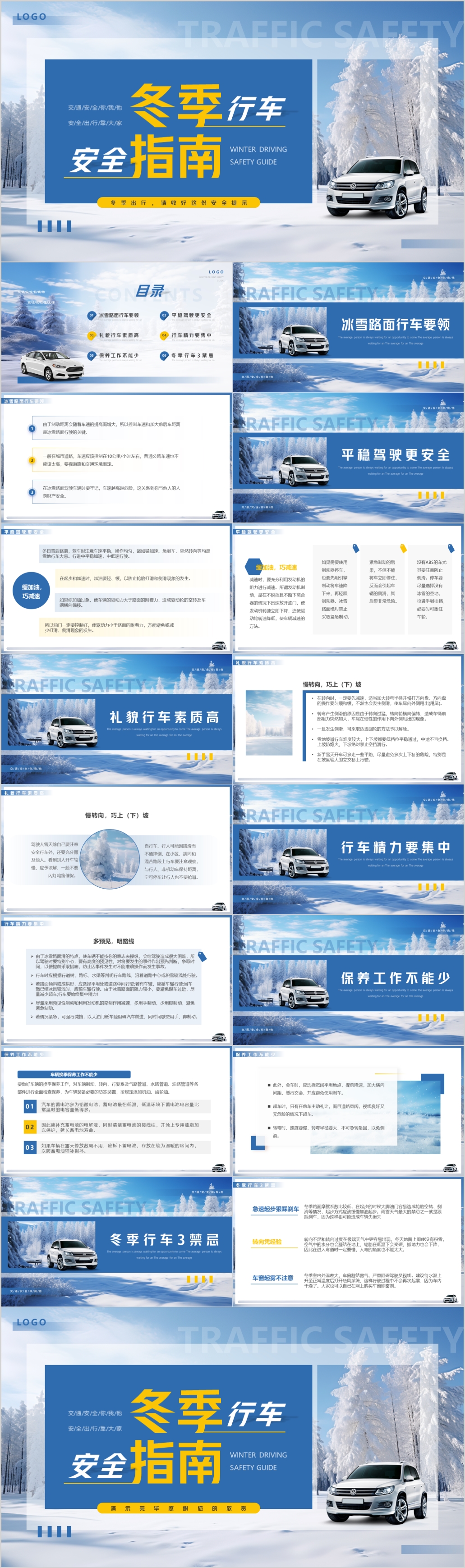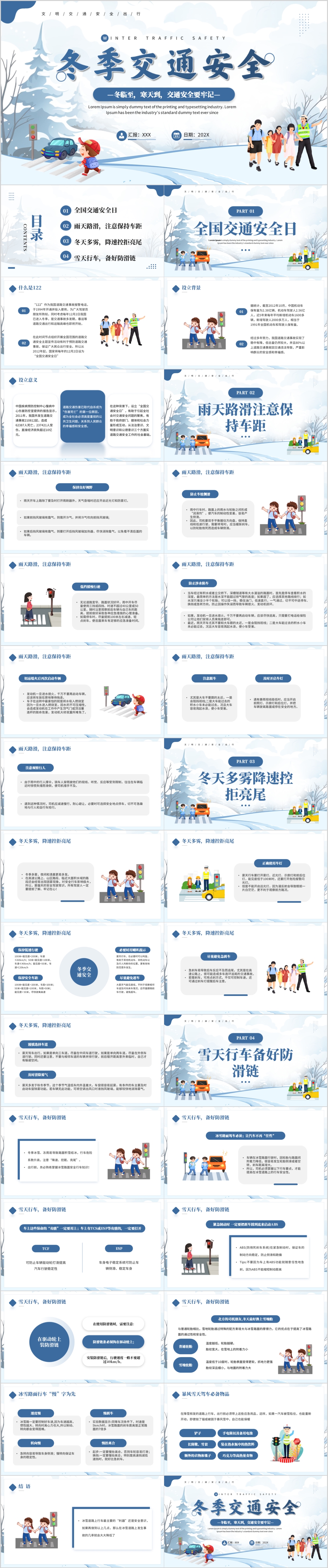 蓝色卡通冬季道路行车交通安全教育PPT模板