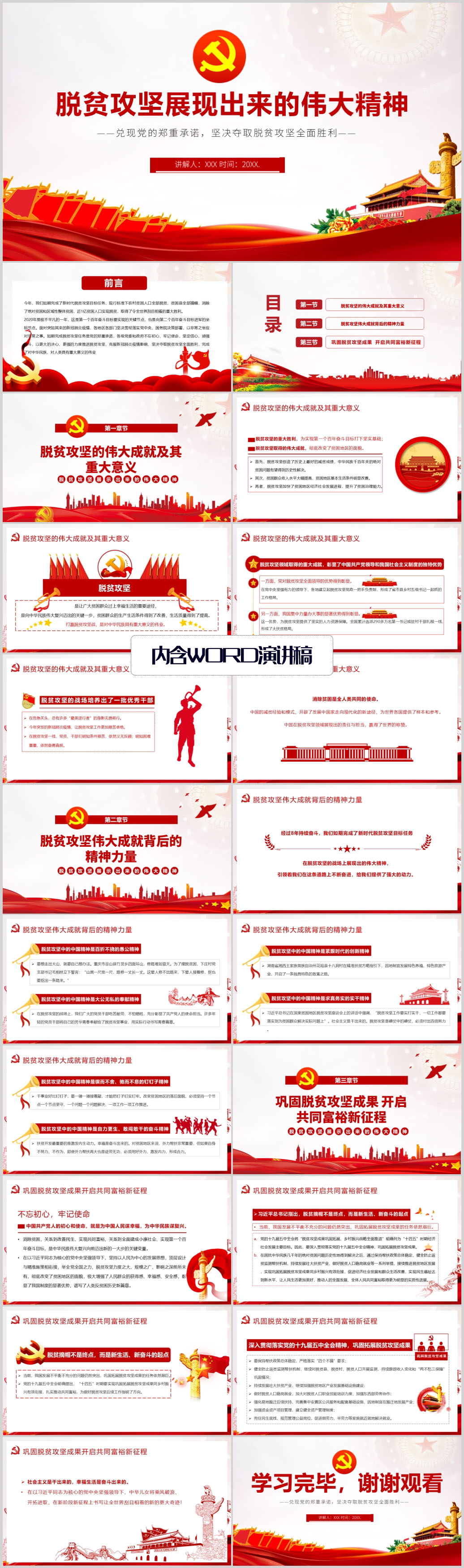 坚决夺取脱贫攻坚全面胜利的伟大精神党课PPT模板(内含WORD演讲稿)