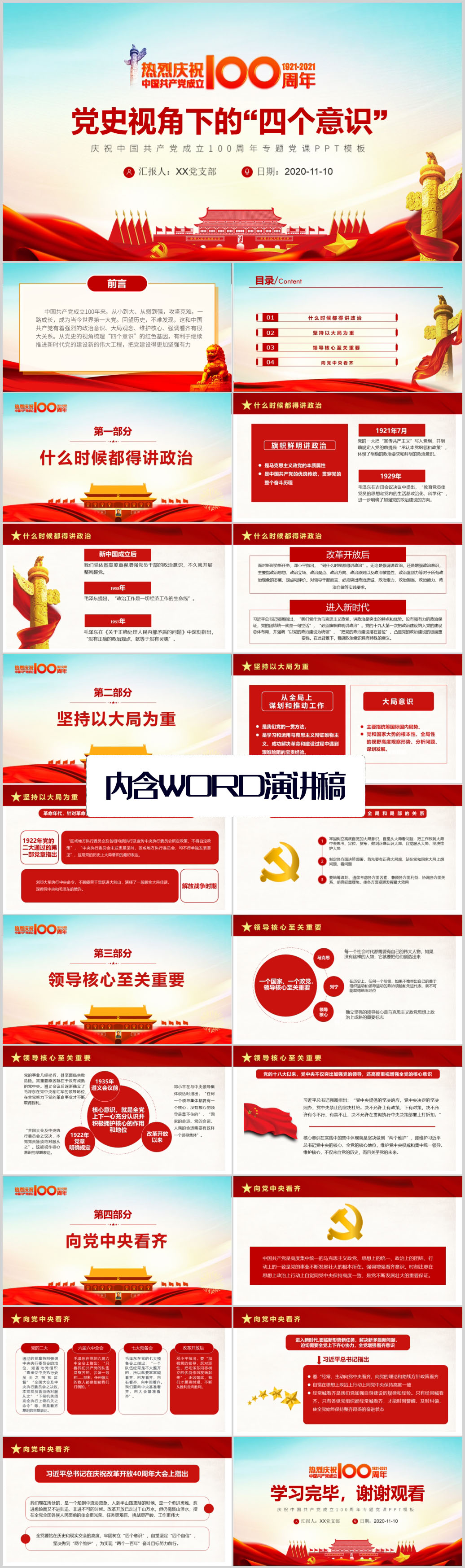 学习七一建党100周年党史视角下的四个意识建党节党课PPT模板(内含WORD演讲稿