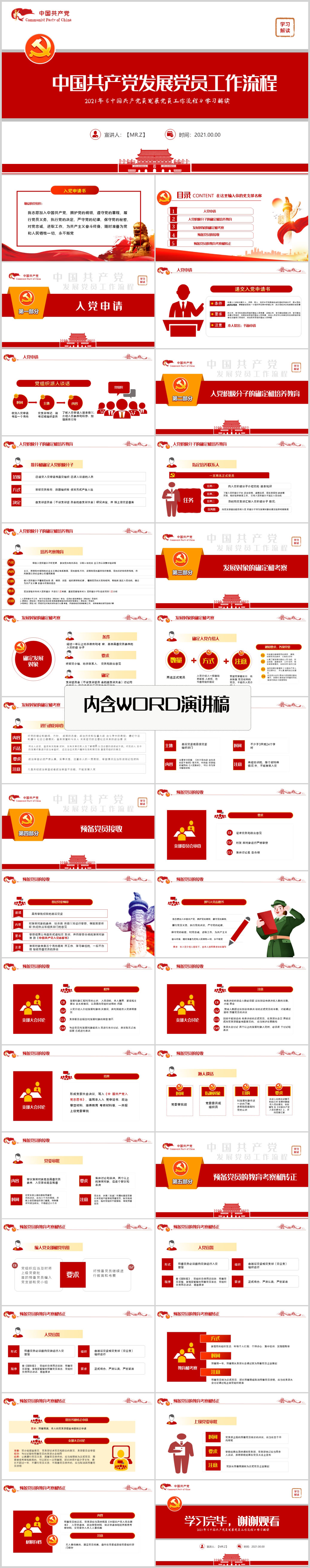 2021年入党申请预备党员发展党员工作流程培训党课PPT模板(内含WORD演讲稿)