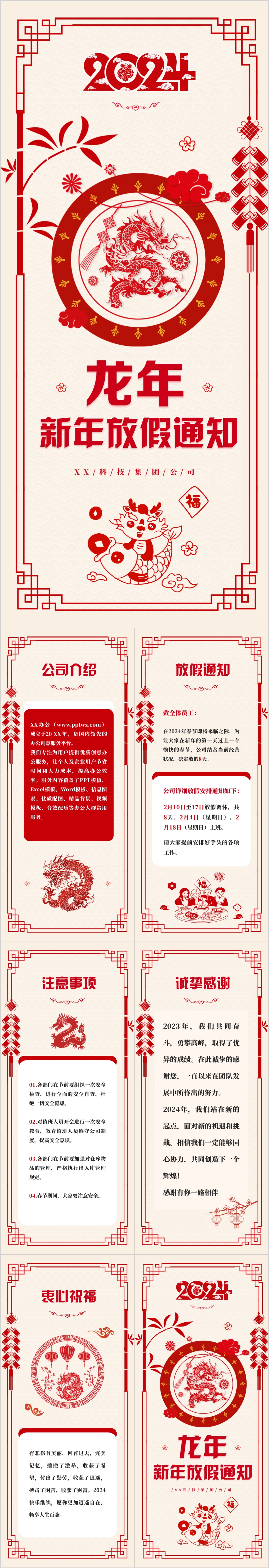 2024剪纸竖屏新年元旦春节放假通知ppt模板
